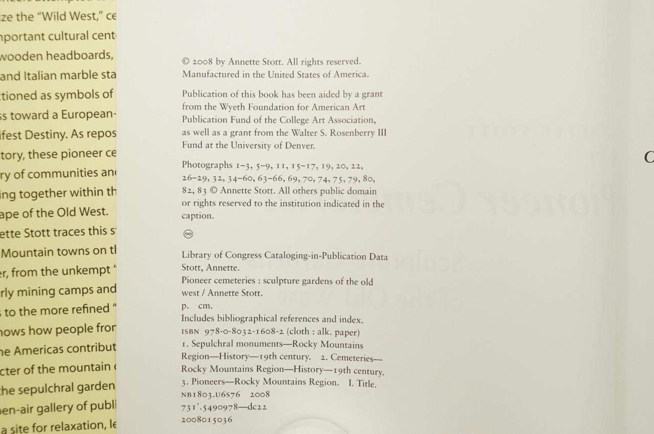 Pioneer Cemeteries Sculpture Gardens of the Old West by Annette Stott HB Book - 2008. DJ present with wear to the inside bottom edge corner. Book is crisp. No smoke or pet odors.