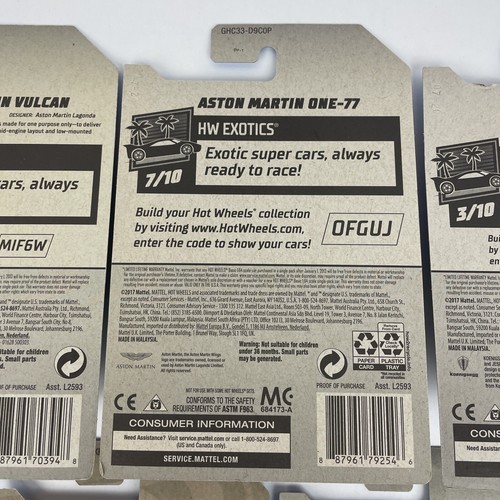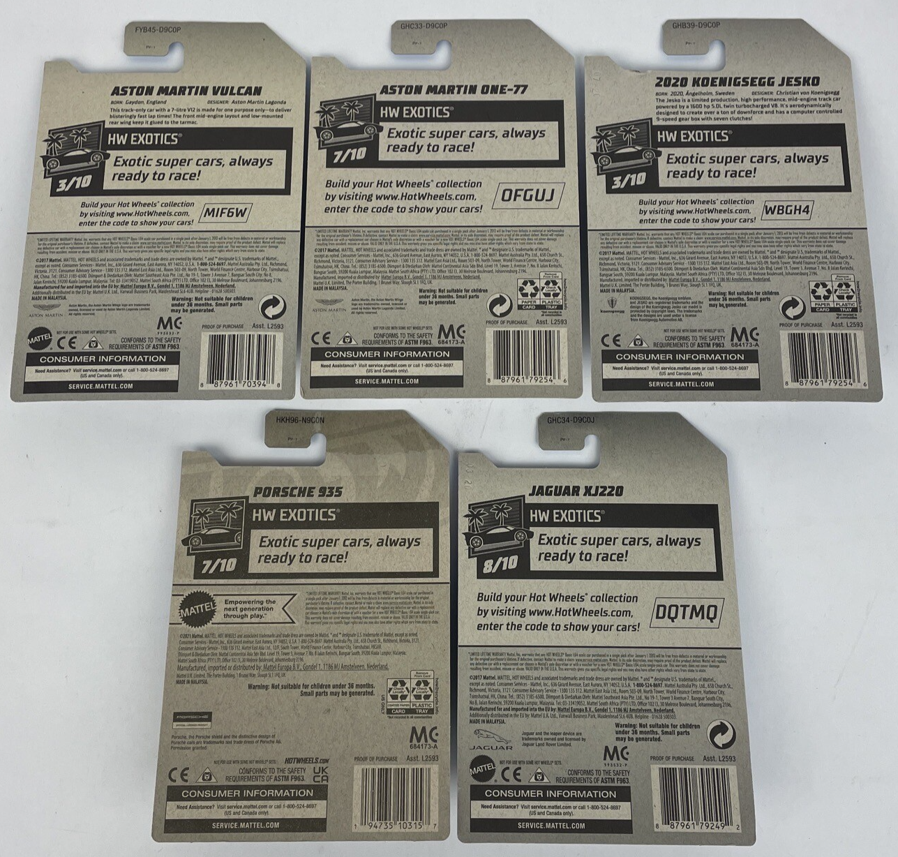 5 x Mattel Hot Wheels HW EXOTICS 2017 2021 Jaguar XJ220, Porsche 935, Austin Martin One-77 Austin Martin Vulcan, 2020 Koenigsegg Jesko