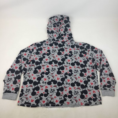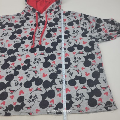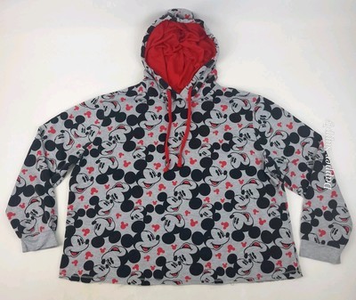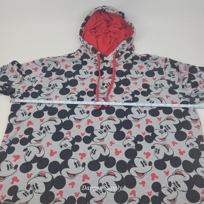 Disney Store Mickey Mouse Hoodie XL All-Over Print Sweatshirt Gray Red Cut Hem