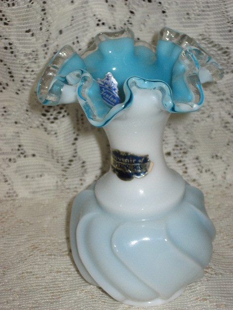 This very pretty vase is still marked with authentic Fenton sticker. A second sticker states souvenir of Superior WI. I believe color is opalescent Parisian blue. Fluted edges about 4" add beauty. Sorry no Fenton box. Measures 6" tall X 2" diam base.