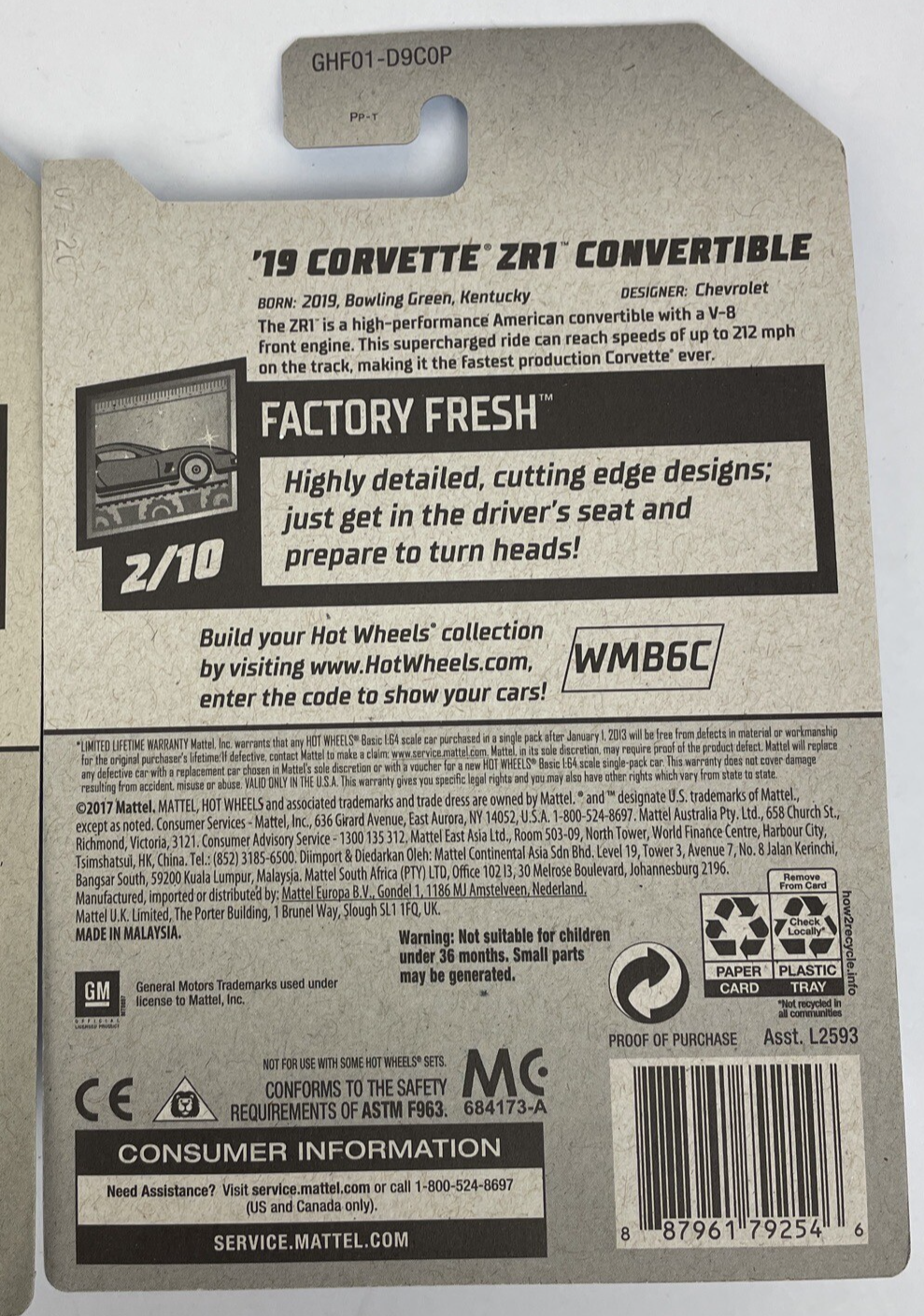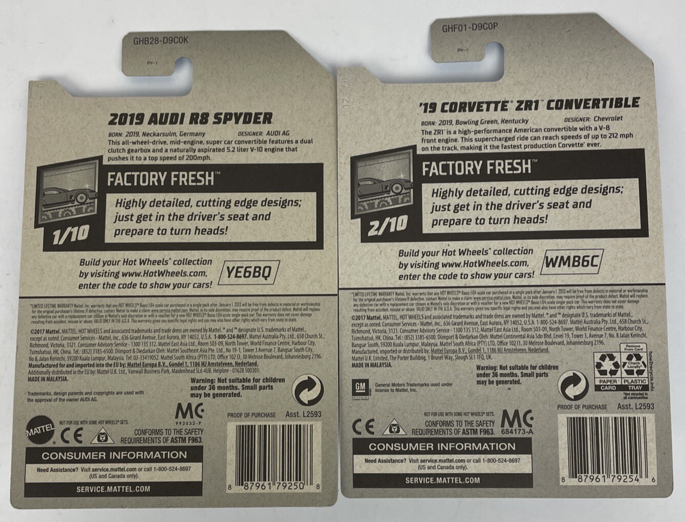 Lot of 2 x 2017 HOT WHEELS FACTORY FRESH SERIES Blue '19 Corvette ZR1 Convertible + White 2019 Audi R8 Spyder Convertible