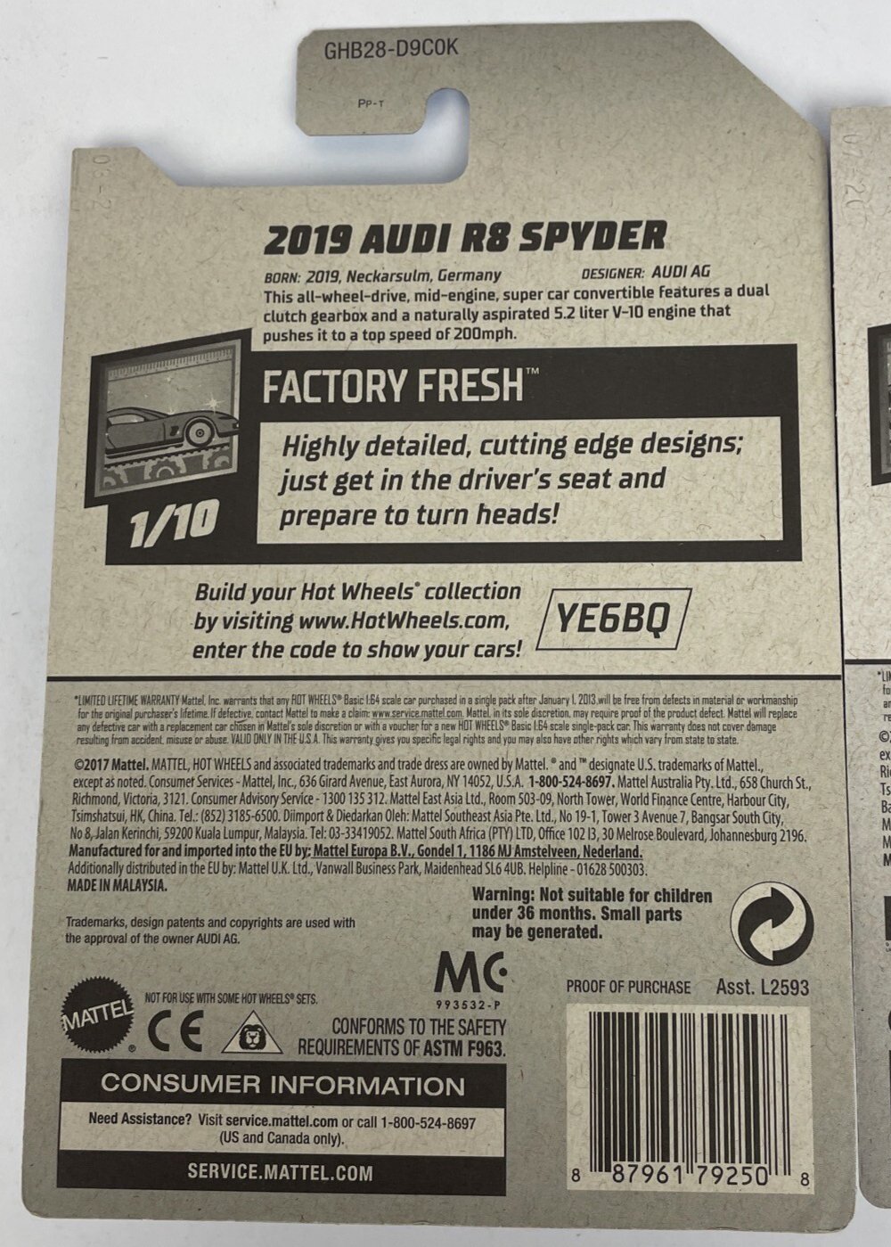 2 x 2017 HOT WHEELS FACTORY FRESH SERIES '19 Corvette ZR1 + 2019 Audi R8 Spyder