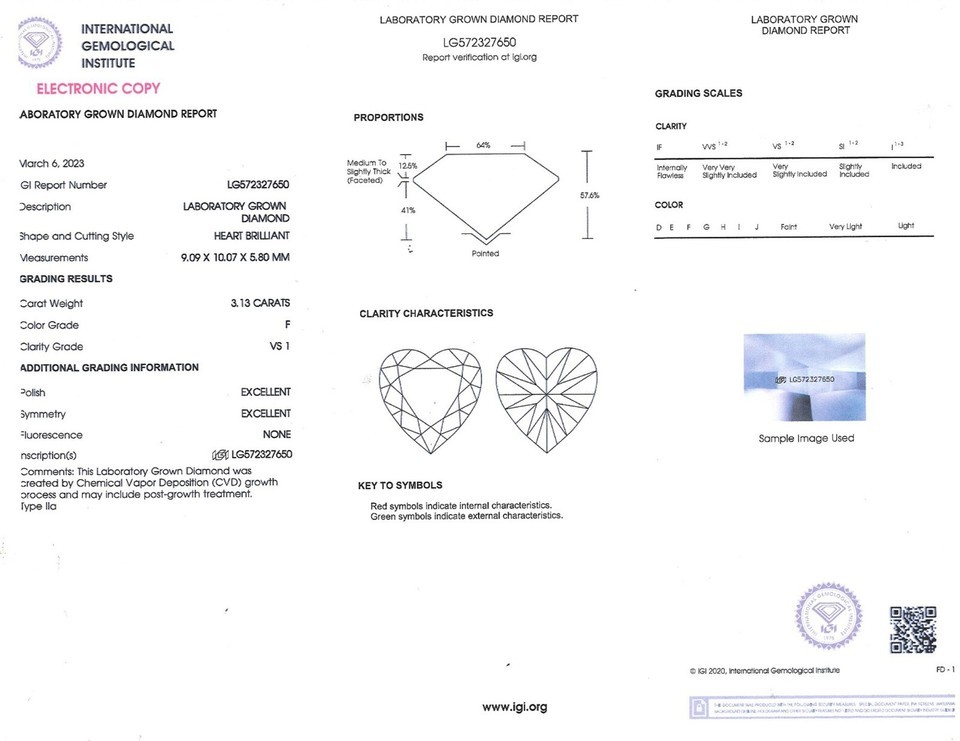Authenticity Guarantee IGI Heart Brilliant Cut 3.13 CT F-VS1 Lab Grown Diamo...