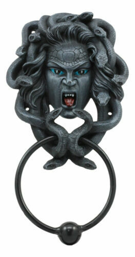 This Severed Head Of Medusa Door Knocker Sculptural Decor is made of designer composite resin, hand painted and polished individually. The knocker part is made of cast iron metal. Item does NOT come with a metal plate. Color Tone May Vary From Pictures.