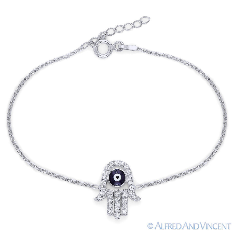 Hamsa Hand of Fatima Judaica Kabbalah Evil Eye Charm CZ Sterling Silver Bracelet