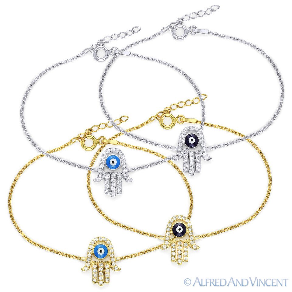 The featured bracelet showcases finely crafted Hamsa Hands cast in .925 sterling silver each set with an evil eye glass bead paved with cubic zirconia crystals. The hands are then attached to sterling silver chains finished with spring-ring clasps extender links so you can wear each securely on your wrist.