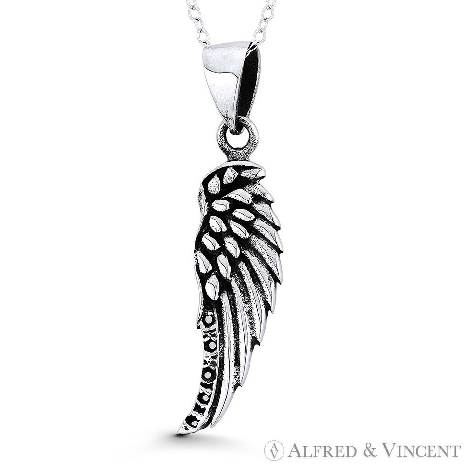 The featured pendant is cast in oxidized .925 sterling silver and showcases a highly-detailed angel's wings w/ feathers. The double-wing charm is then finished with a sturdy bail that can accommodate most standard-width chains.