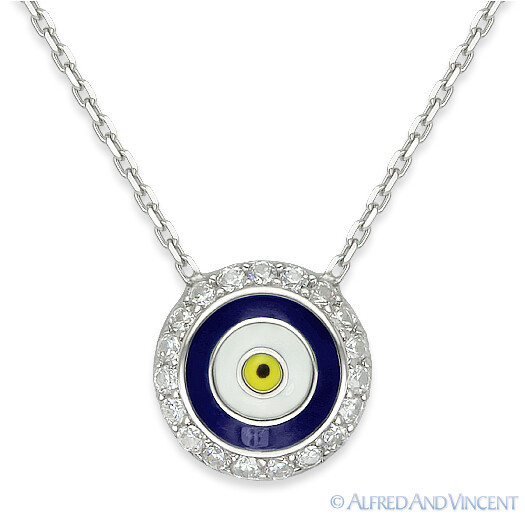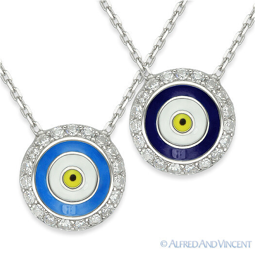 Evil Eye Enamel CZ Crystal Charm Pendant Chain Necklace in .925 Sterling Silver
