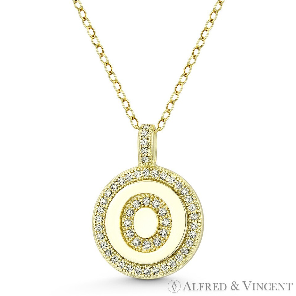 The featured pendant is cast in .925 sterling silver w/ 14k yellow gold plating and showcases a round disc adorned with cubic zirconia crystals paved along the bail, around the disc, and the letter "O" centerpiece design.