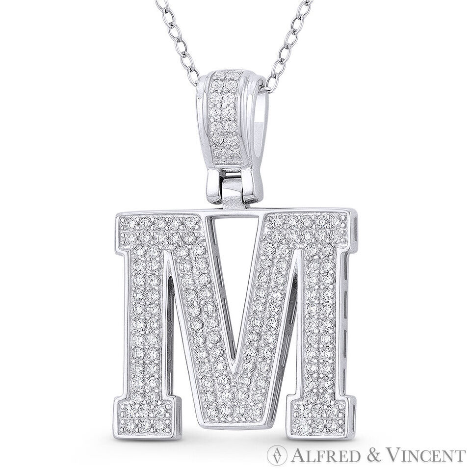Initial Letter "M" Block Script CZ Crystal 925 Sterling Silver & Rhodium Pendant