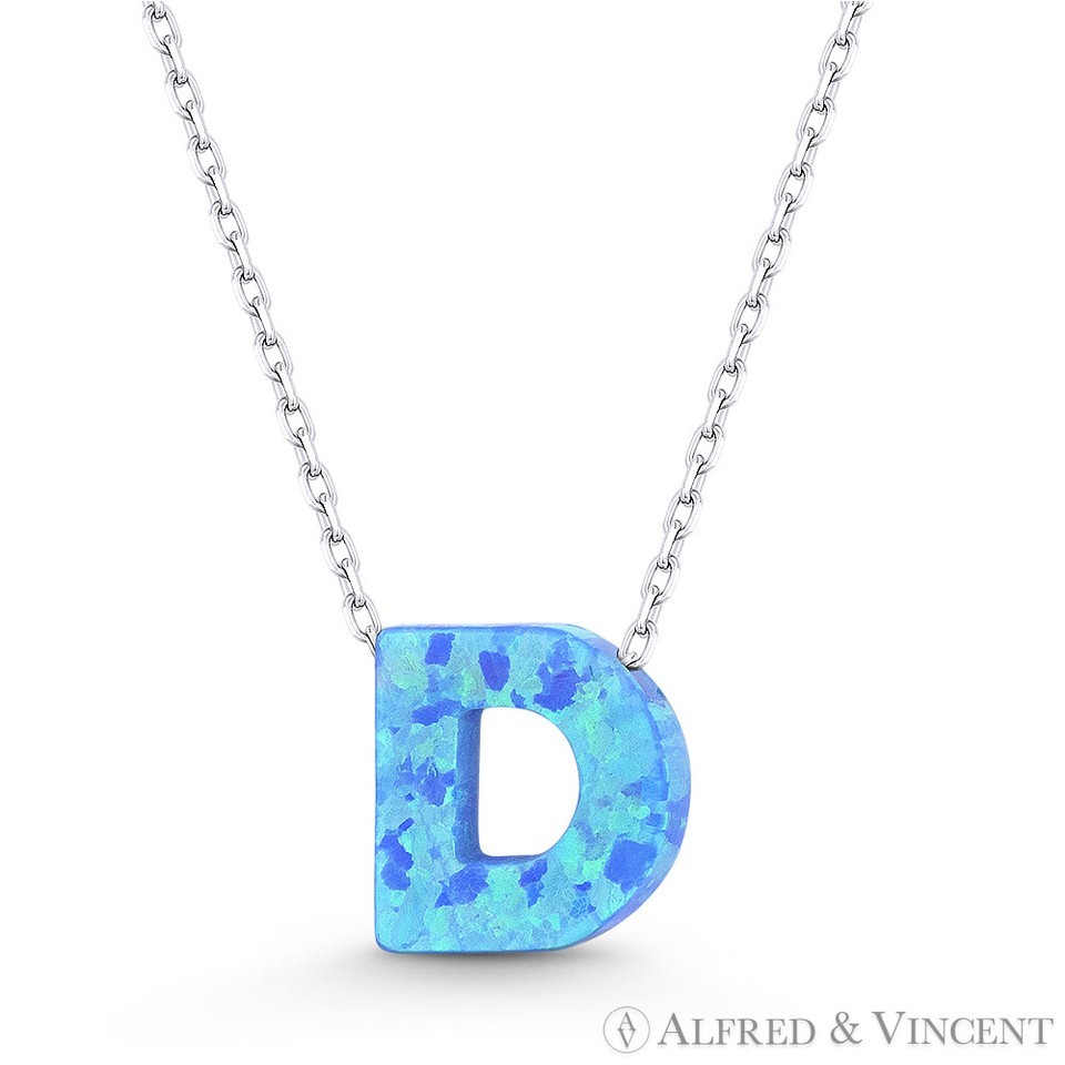 The featured necklace showcases a 10mm (0.4in.) long initial "D" pendant made from synthetic pacific-blue opal. The initial pendant slides along a rhodium-plated .925 sterling silver chain finished w/ a spring-ring clasp for secure wear.