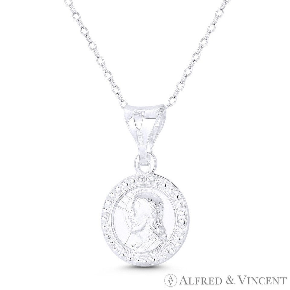 The featured Italian-made pendant is cast in .925 sterling silver and showcases a 15mm (0.6in) round button charm w/ an embossed image of Jesus Christ. The button charm is then finished with a sturdy bail that can accommodate most average-sized chains.