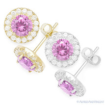 The featured October birthstone earrings showcase halo settings crafted in .925 sterling silver adorned with pink round cut cubic zirconia crystals surrounded by clear cz accents. The earrings are then finished with push-back clasps so they can be worn securely on your ears.