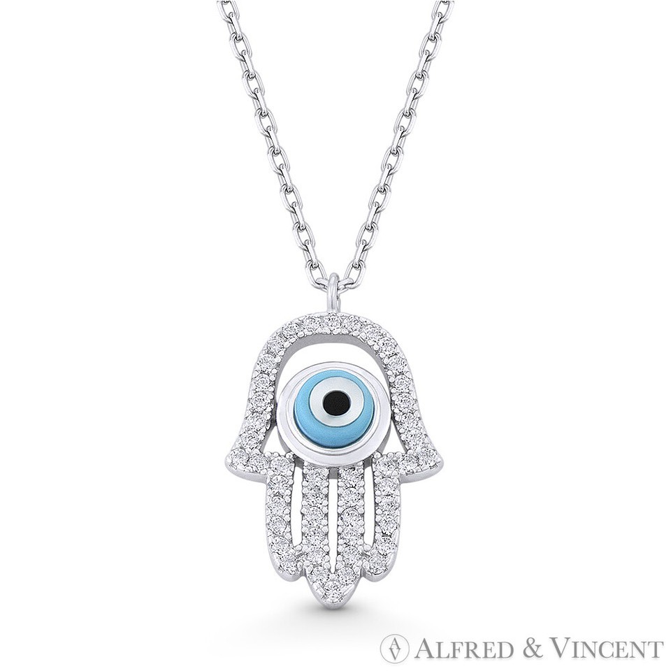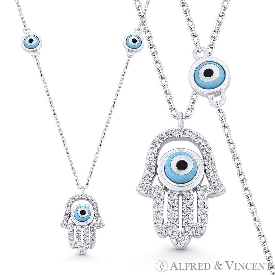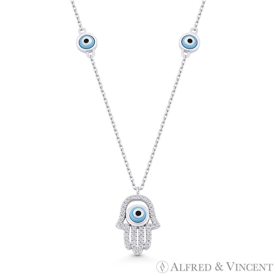 Hamsa Hand Evil Eye Bead Charm w/ CZ Pendant Chain Necklace in .925 Sterling Silver
