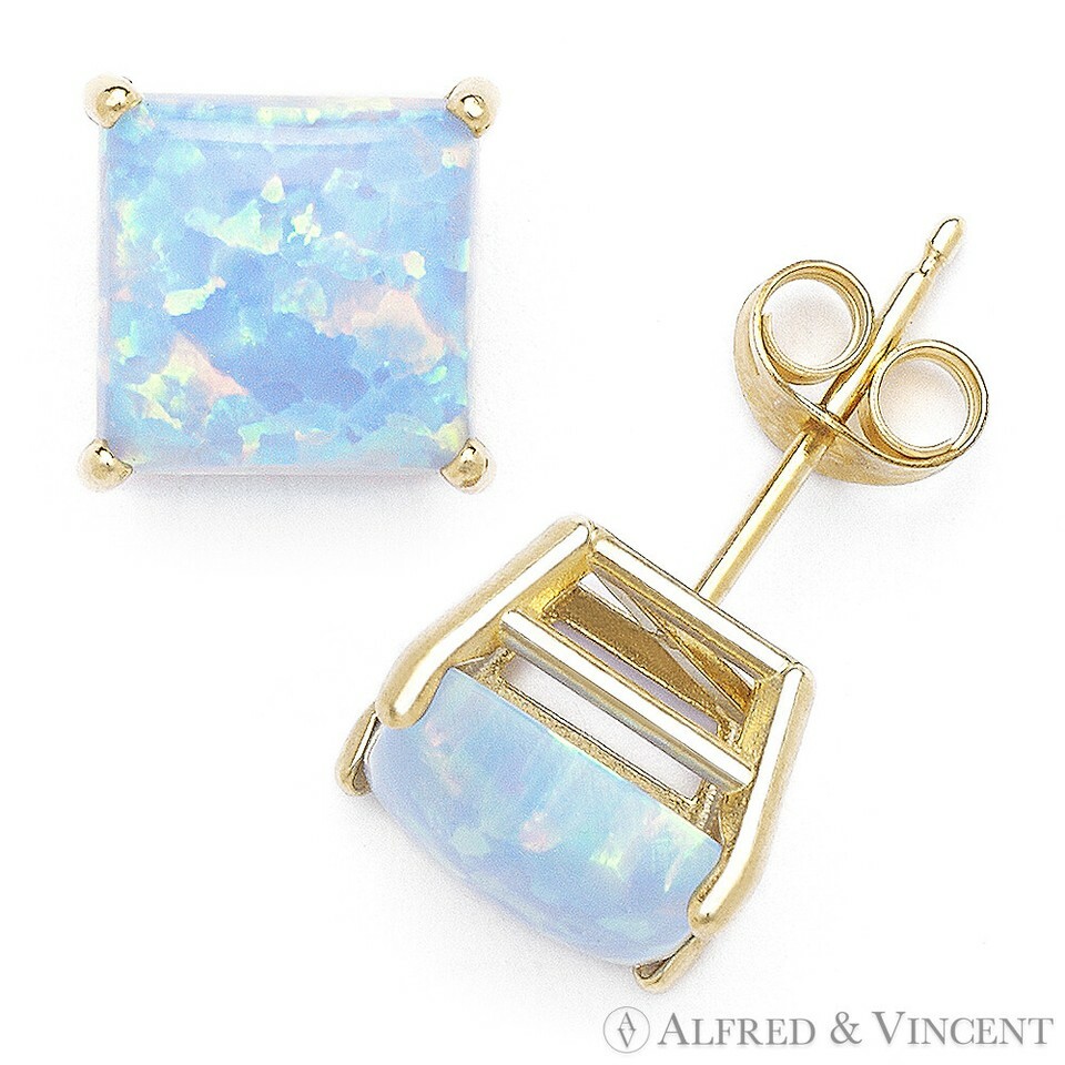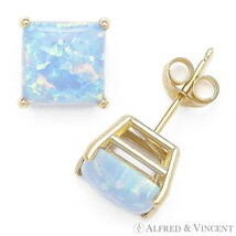 Fiery Azure Blue Square Cut Lab-Created Opal Studs 14k Yellow Gold Stud Earrings