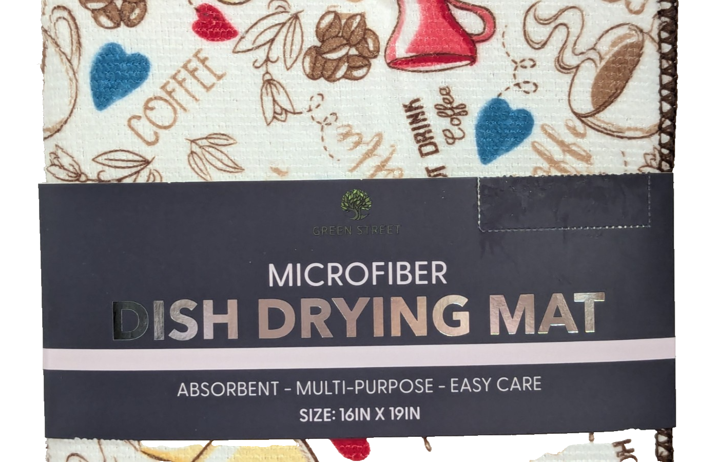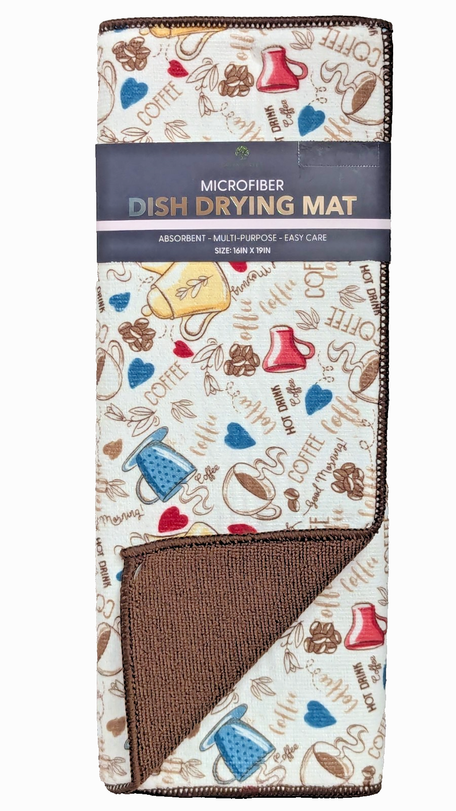 Add a touch of coffee charm to your kitchen with this coffee pot and cups dish drying mat.