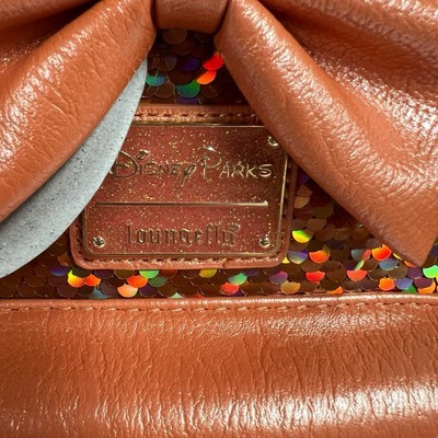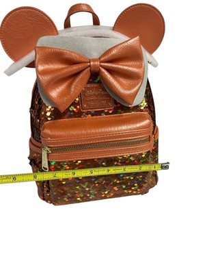 Brand new with tags! This Disney Parks x Loungefly mini backpack in Apricot Crush features shimmering multicolor sequins, faux leather coral-toned accents, classic Minnie Mouse ears, and a matching oversized bow. Features include gold-tone hardware, a front zip pocket, side slip pockets, and adjustable padded straps. A stunning and collectible piece for Disney fans!