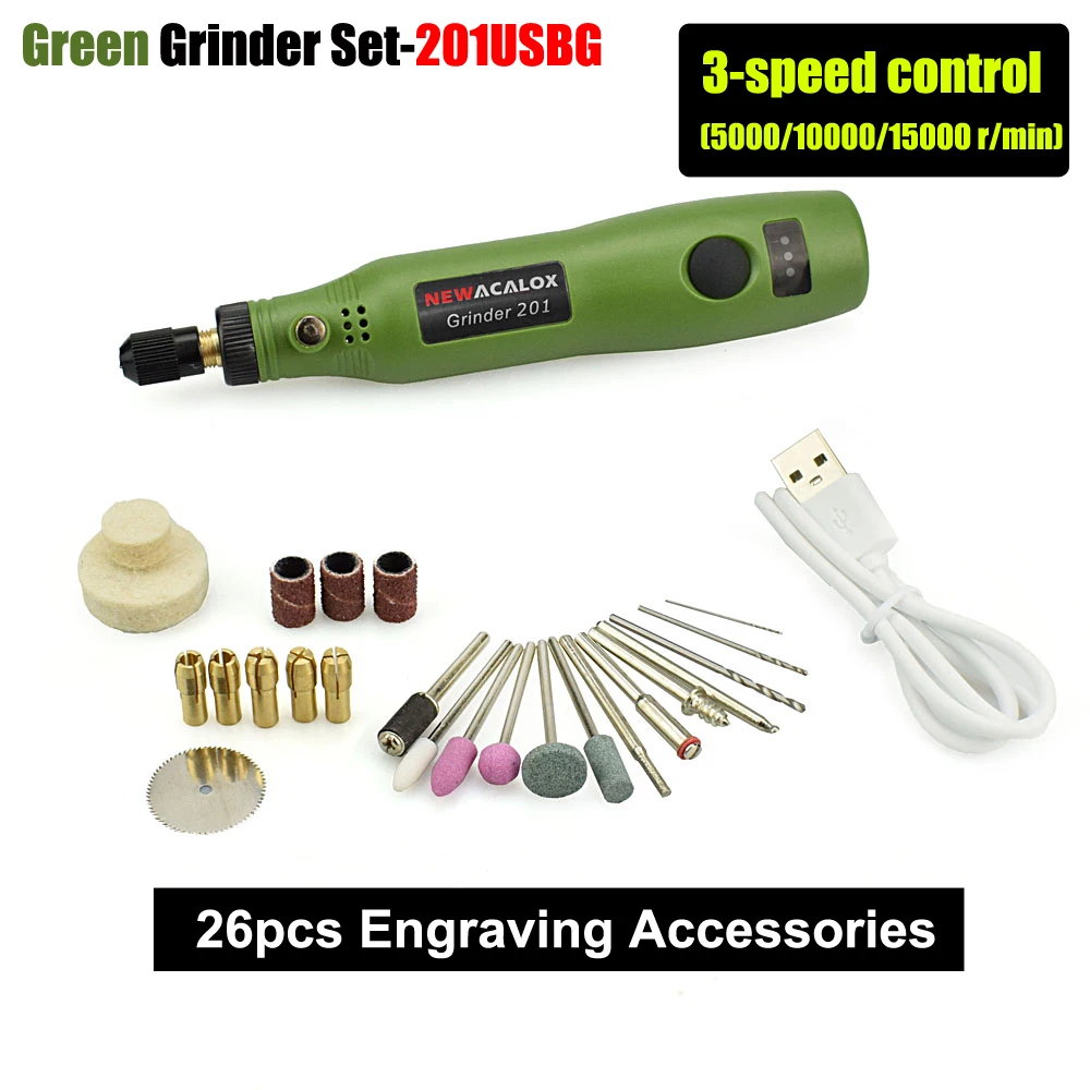 NEWACALOX USB Charging 10W Grinding Machine Mini Wireless Variable Speed Rotary Tools Kit Engraver Pen for Milling Polishing 32964838270wt Specifications : Brand Name: NEWACALOX Type: Mini Grinder Power Source: Electricity Origin: CN(Origin) Certification: CE Rated Voltage: 220V Disc Bore Diameter: 14mm Disc Diameter: 100mm No-Load Speed: 5000/10000/15000 r/min Rated Input Power: 10W Dimensions: 21.2 * 7.1 * 5.5cm Variable Speed: Yes Usage: Home DIY Frequency: 50-60Hz Disc(Wheel) Type: Grinding Disc is_customized: Yes Model Number: NEW-201 Weight: 357g Color: Gary/Green/Red Collect Chuck Diameter: 0.5-3.2mm No-Load Speed: 5000/10000/15000 r/min DIY Supplies: Woodworking/Polishing/ Engraving Output Voltage: 3.7V / 10A Charge Voltage: 5V DC (USB)
