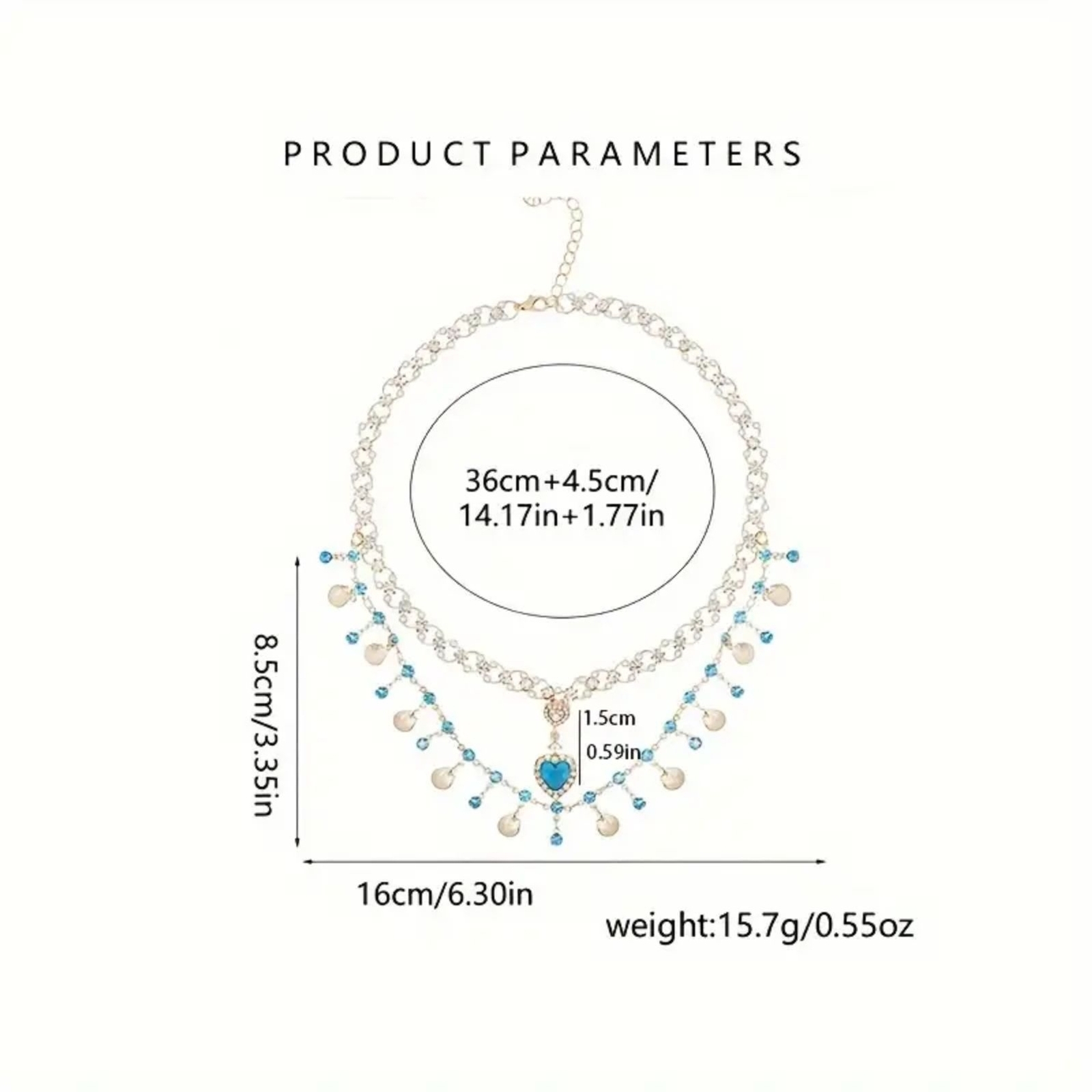 Channel your inner sea goddess with this stunning Mermaid-Inspired Layered Choker Necklace. Featuring a dazzling double-chain design, this piece combines a luxurious gold-tone chain adorned with pearls and rhinestones with a delicate strand of sparkling blue crystals and golden seashell charms. At the center, a bold heart-shaped blue pendant adds a romantic, oceanic touch.
