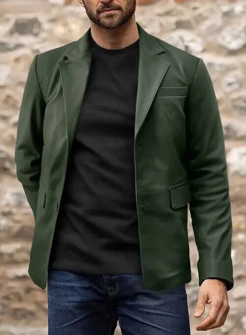 Lambskin Formal Office Wear Men Blazer Green Two-Button Handmade Leather Genuine