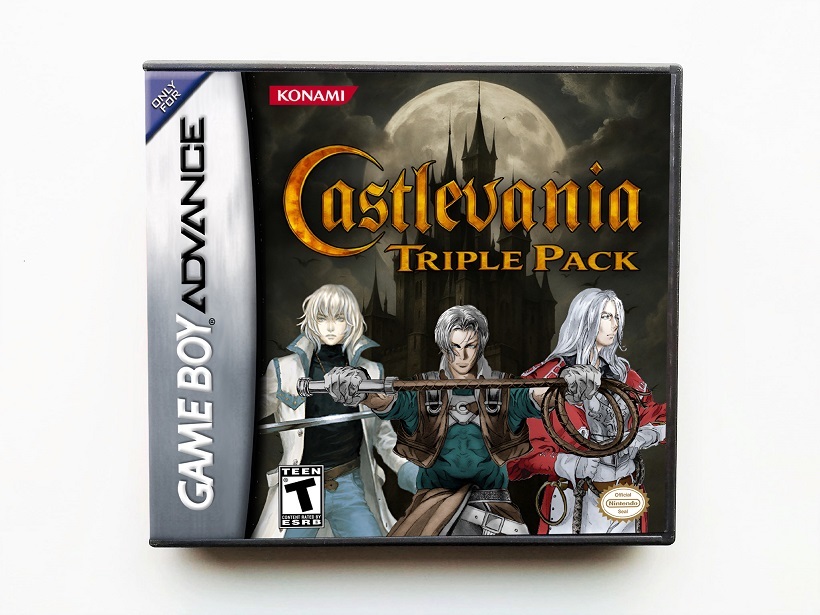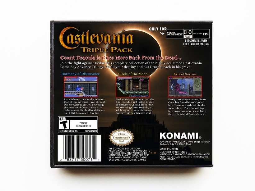 Game Description Castlevania Triple Pack is a custom multicartridge of all 3 Castlevania GBA games on one cartridge: Circle of the Moon, Harmony of Dissonance, and Aria of Sorrow. Save function works using flash memory without using a battery backup.