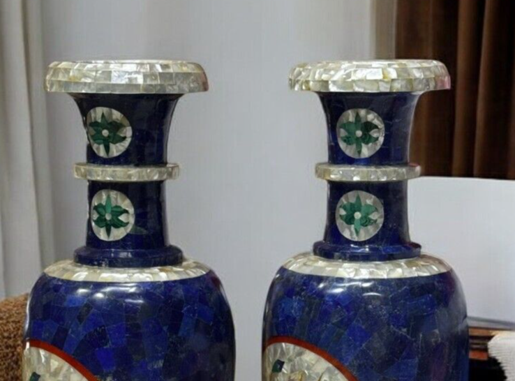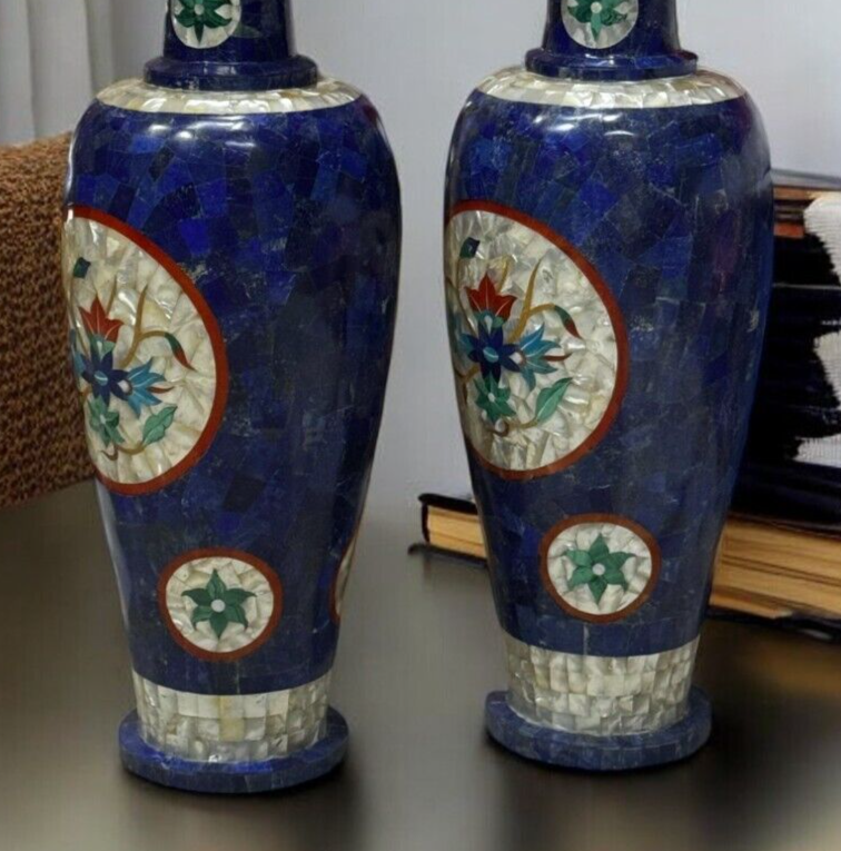 Marble Flower Vase of 2 Pcs Inlay Lapis & MOP Stone Collectible Centerpiece Deco