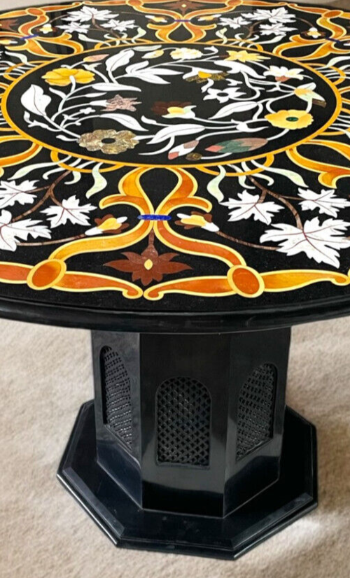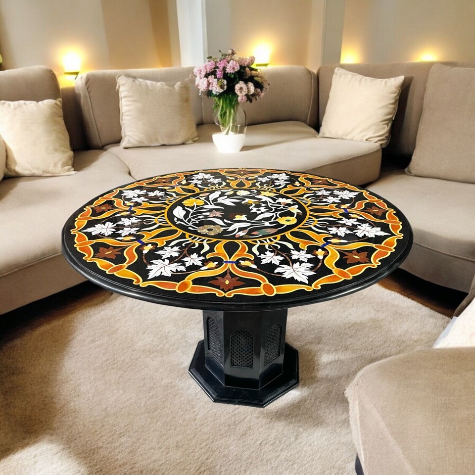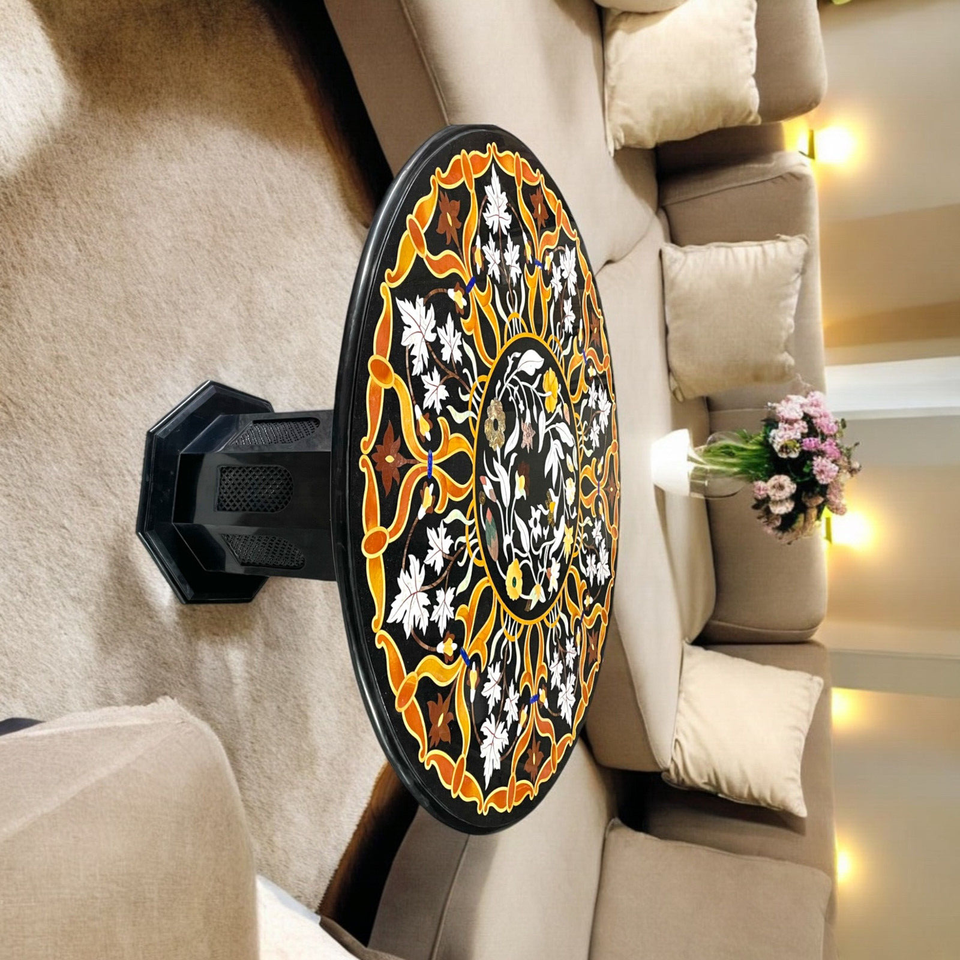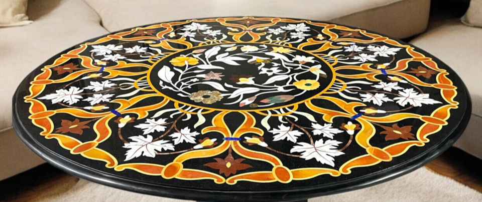 Elegant Round Black Marble Center Sofa Dec Handmade Art Floral Modern Coffee Top