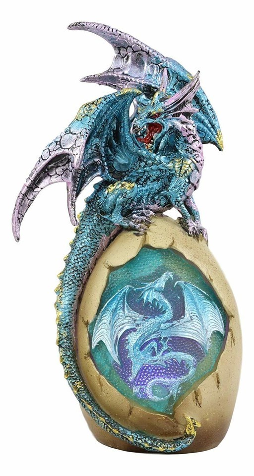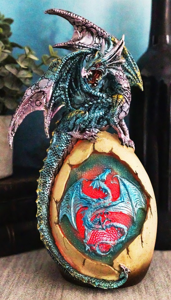 ? A beautiful Dragon perches on a Hatchling Egg which glows with multiple colors. Inside the egg is a Frozen Lunar Dragon which fulfills the prophecy of the Dragonlands. The dragon atop the egg is a mighty guardian named the aurora borealis and thus it carries the colors similar to the natural phenomenon. This sculpture makes the perfect night light or courtesy light for any room and home! It is also a delightful gift for any fans of dragons.