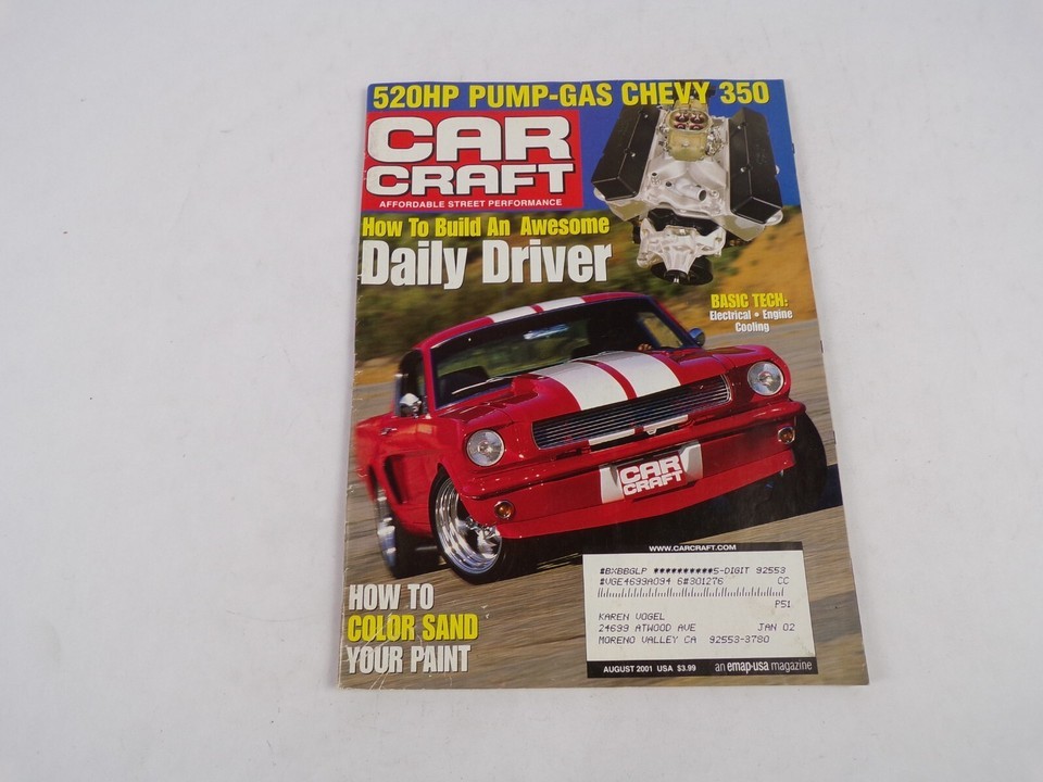 Featuring: August 2001 Car Craft How To build An Awesome Daily Driver Pump Gas Chevy 350 - Electrical Engine Cooling -Magazine is complete and in nice condition -Showing only light to moderate wear