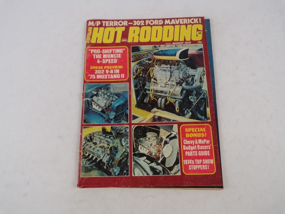 Featuring: August 1974 Hot Rodding Magazine M/P Terror-320 Ford Maverick! Popular ''Pro-Shi - ''Pro-Shifting'' The Muncie 4-Speed - Sneak Preview: 302 V-8 In '75 Mustang 2 - Magazine is complete and in nice condition - Showing only light to moderate wear