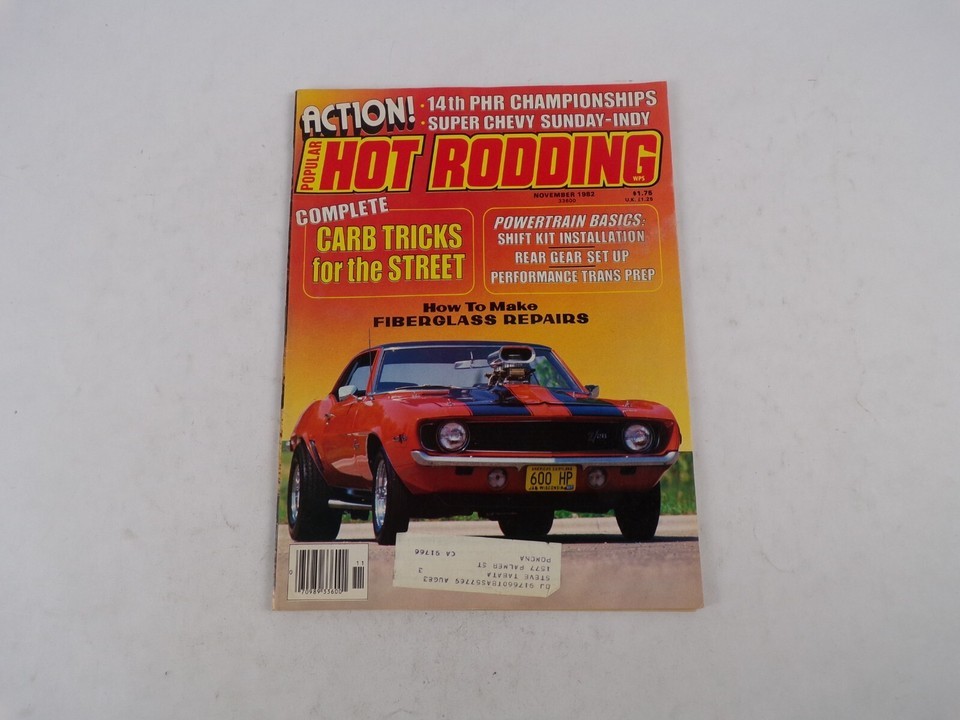 Featuring: November 1982 Hot Rod Magazine Action! 14th PHR Championships Super Chevy Sunday - Complete Carb Tricks For The Street - Powertrain Basics: Shift Kit Installation - Magazine is complete and in nice condition - Showing only light to moderate wear
