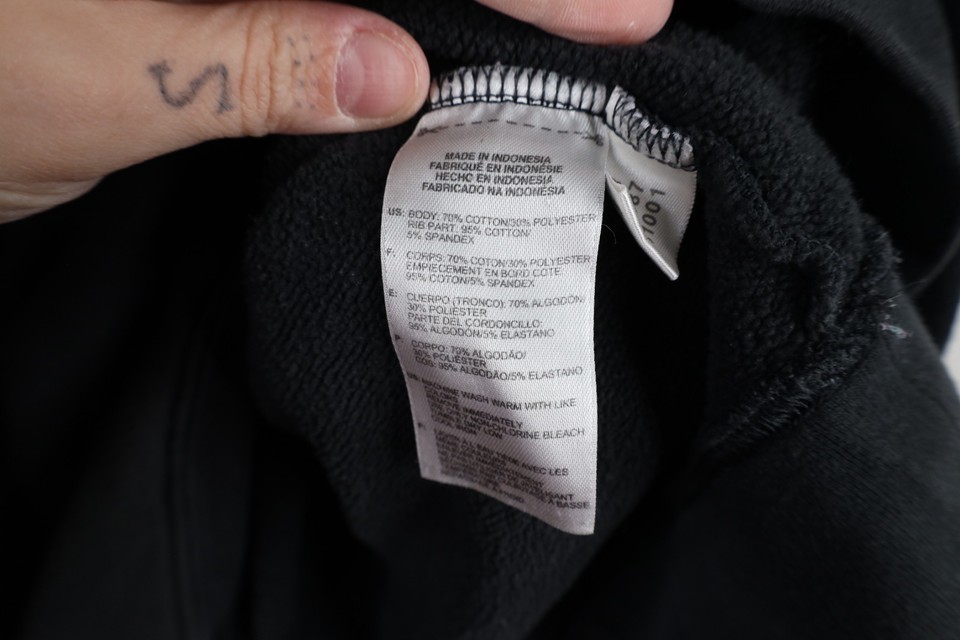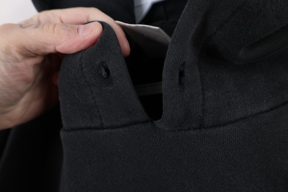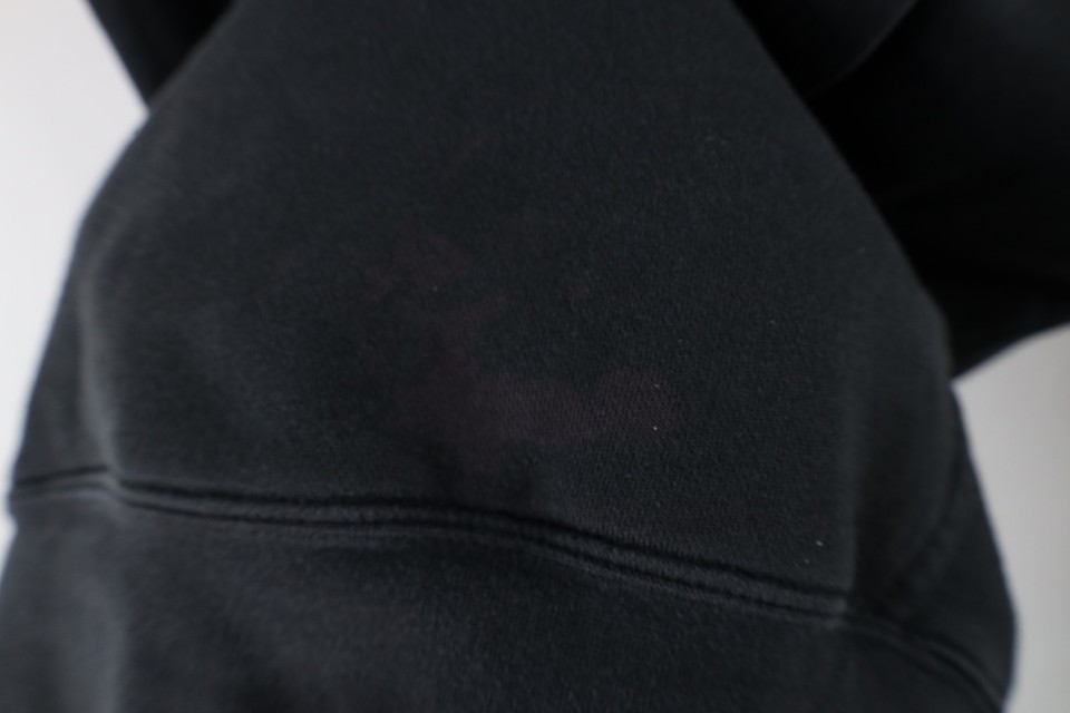 Stains, dark spots throughout. Color faded. Missing hoodie string. Loose threads back bottom. Hood, cuffs discolored, Has pilling