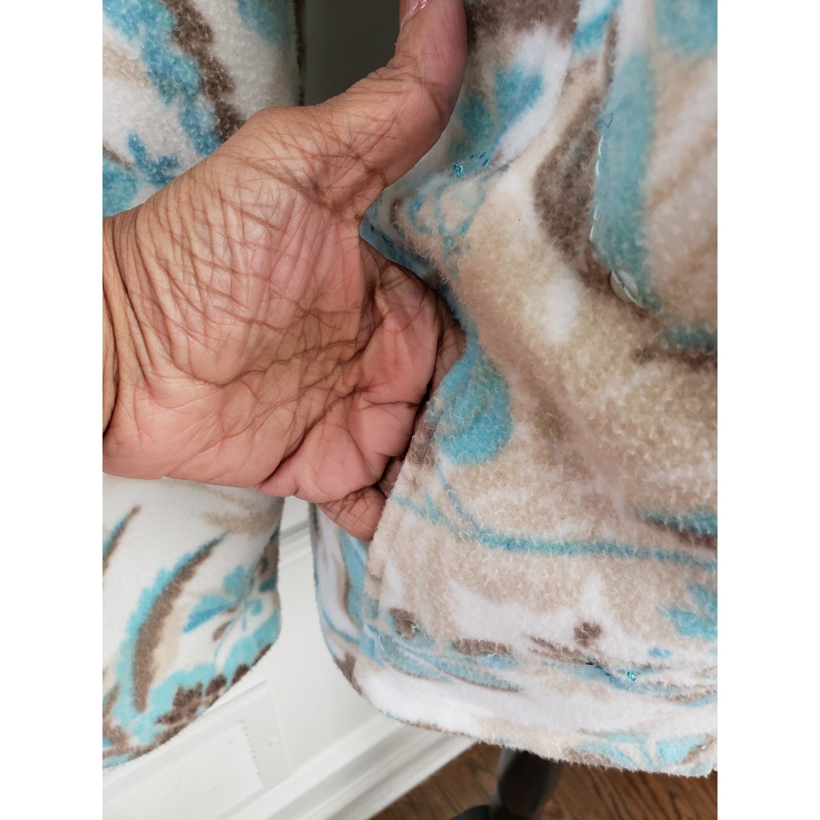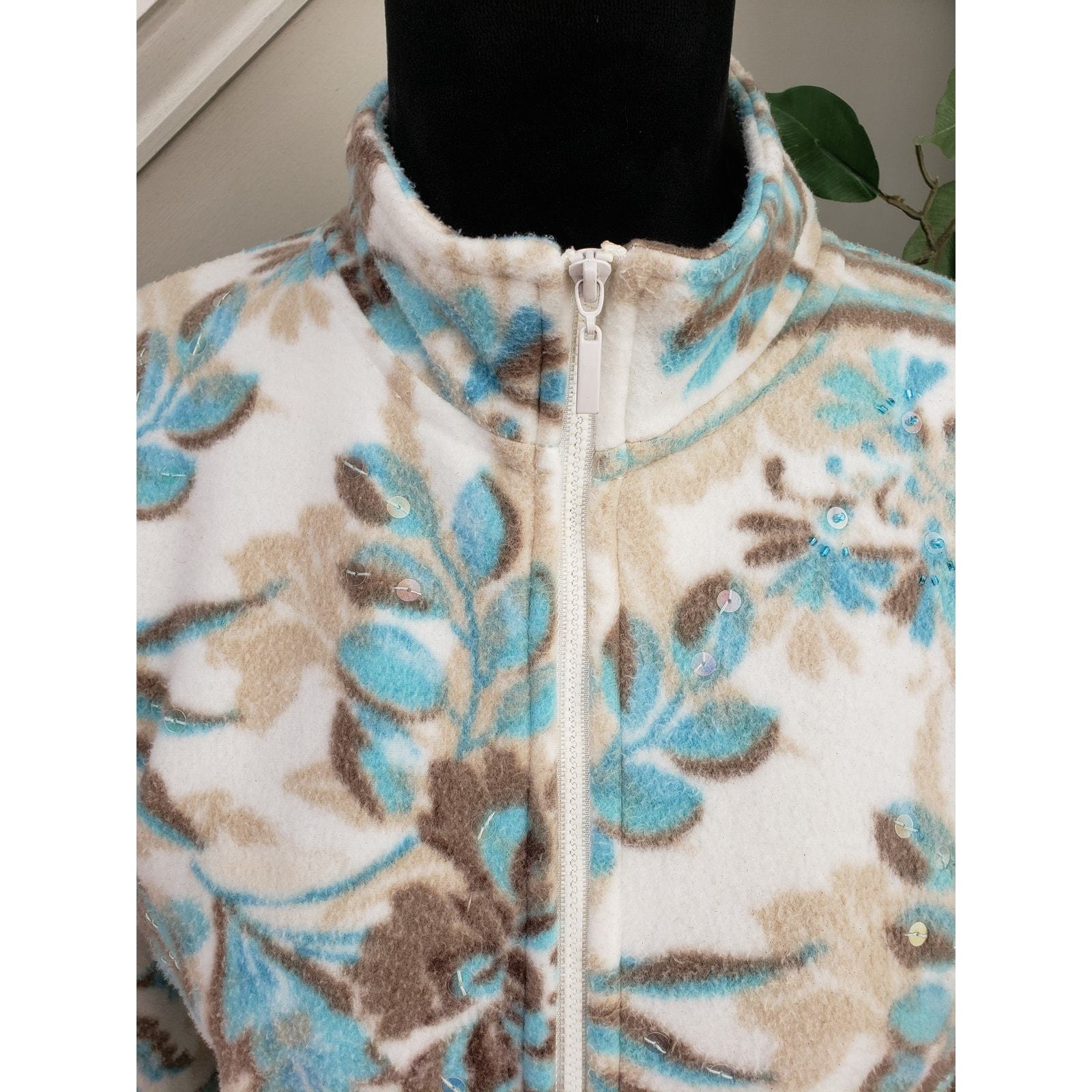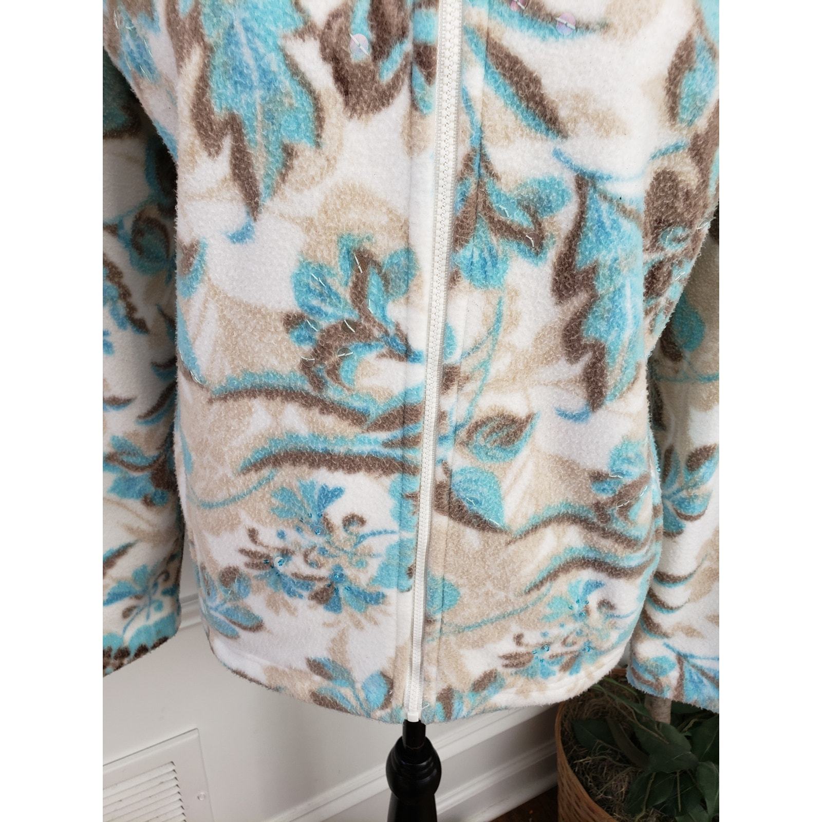 Cozy and soft, this Alfred Dunner fleece jacket features a lovely floral print in white, blue, and brown. Designed in a zip-up style with sequin accents and side pockets, it's perfect for chilly days. The petite large size offers a great fit with a mock neck collar and full front zipper. Made from 100% polyester for easy care and warmth.