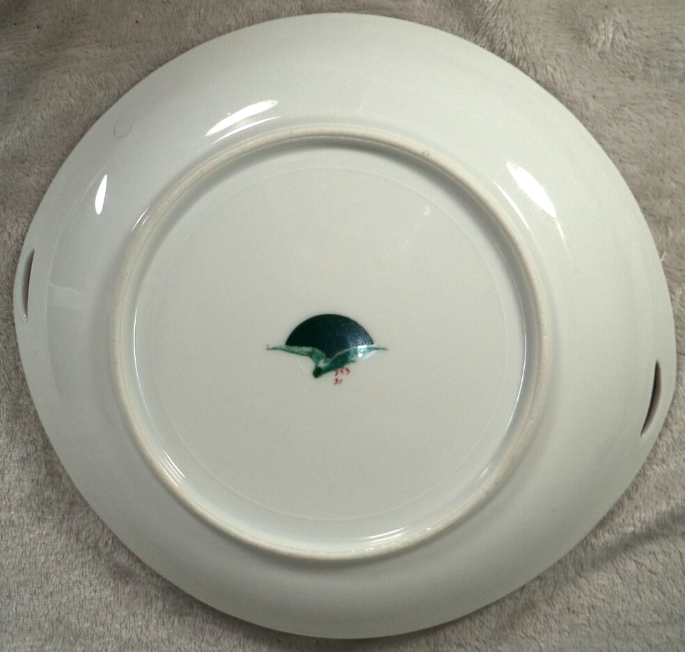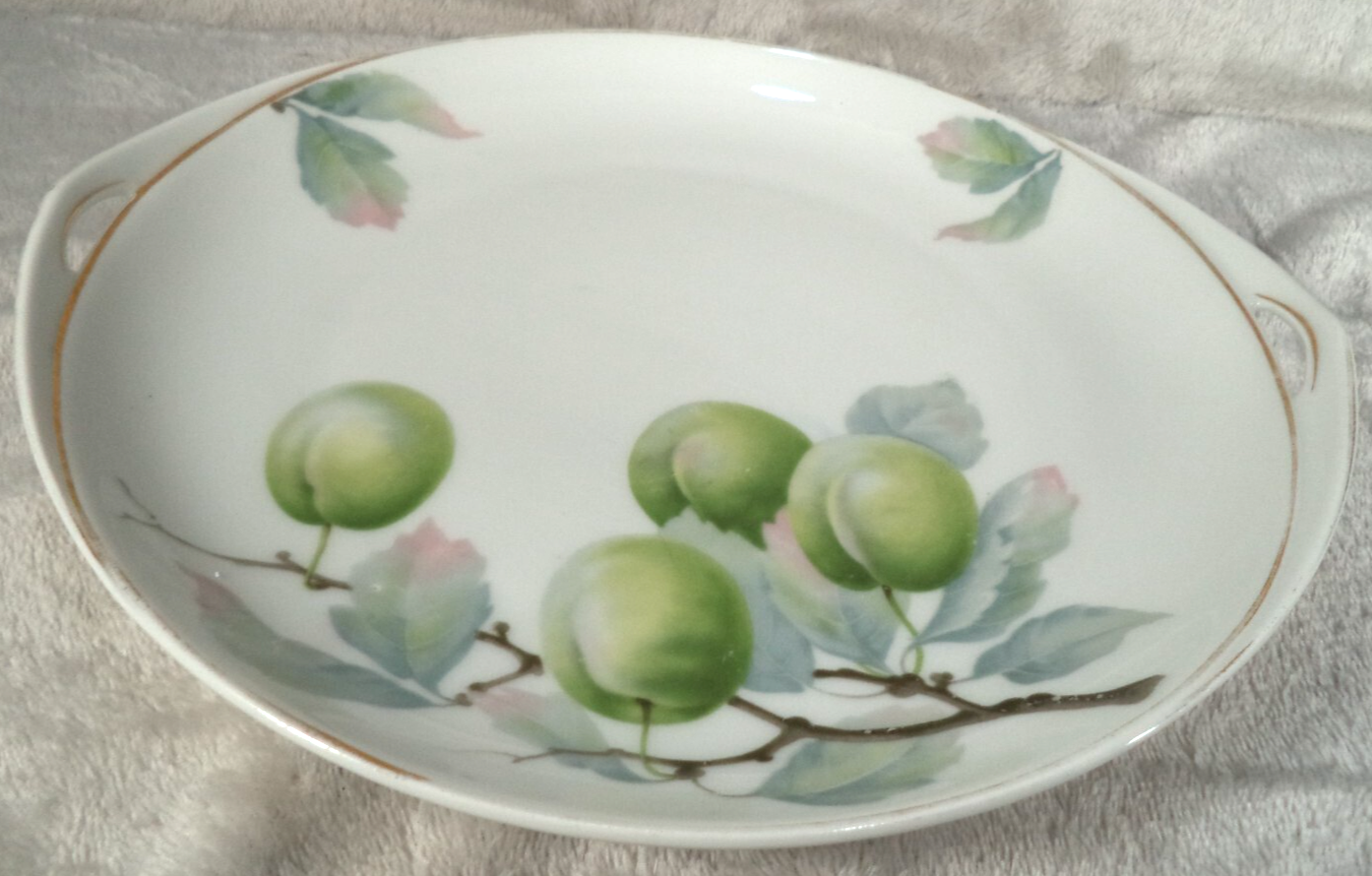 Description: The Rosenthal Bavaria Donatello cake dessert salad plate features a beautiful pattern of green plums and leaves on a round porcelain design. Made in Germany, this vintage piece is an dessert/salad plate with handles, adding both style and functionality to any table setting. Bavaria's reputation for quality craftsmanship is evident in this exquisite piece, making it a charming addition to any collection of decorative serveware or dinnerware.