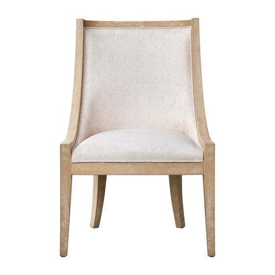 Farmhouse-style dining chair features a curved back profile, recessed arms and an exposed wood frame in reclaimed wheat finish