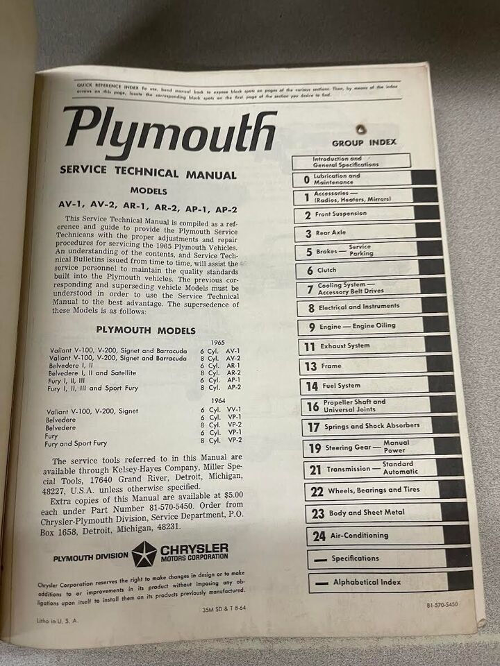 1965 Plymouth Fureur Belvedere Valient Barracuda Shop Manual Technical Servic...