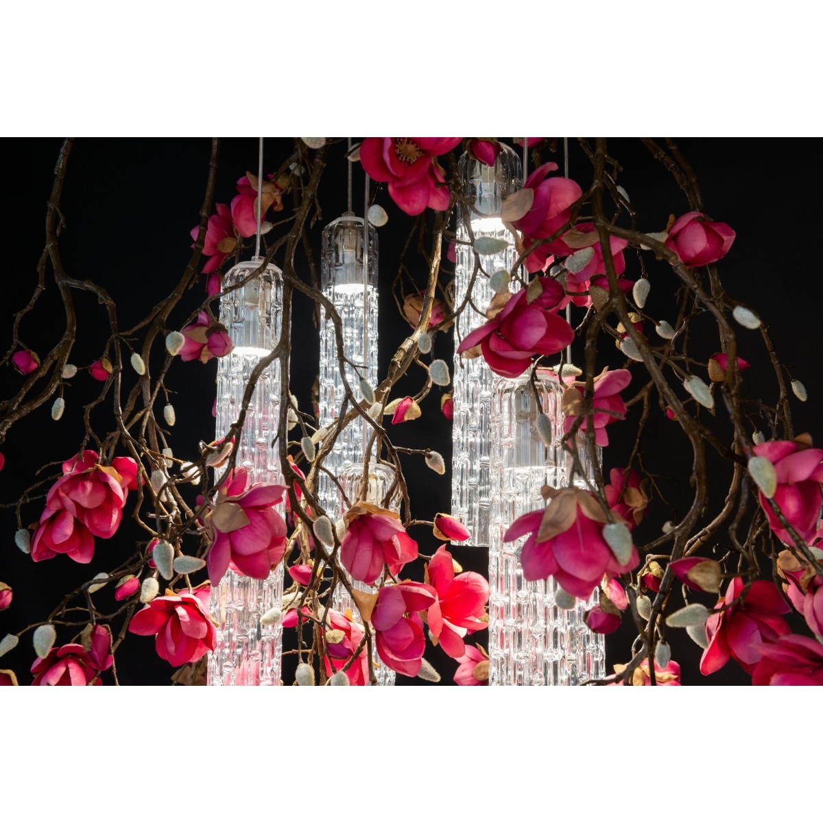 Flower power is an ode to the spring, an enchanting awakening of nature featuring bright colors and delicate nuances. Flower power is a triumph of flowers, which illuminates unique and charming environments in a truly original way. This special, fascinating light source, which is exclusively custom made, consists of a large number of artificial flowers all created by VG, in between which Muranese glass lamps with LED lighting are harmoniously placed. Flower power is a ceiling luminaire designed for both domestic environments and contract spaces, to be used either as an ornament or as an efficient light source
