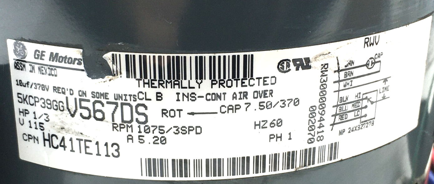 This is GE Motors 5KCP39GGV567DS Blower Motor 1/3HP 1075RPM 3SPD 115V HC41TE113 used part.