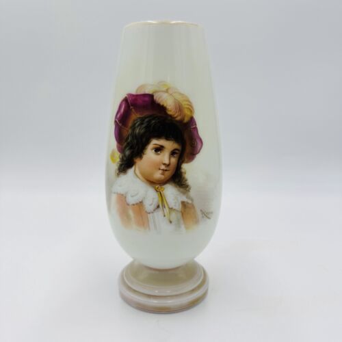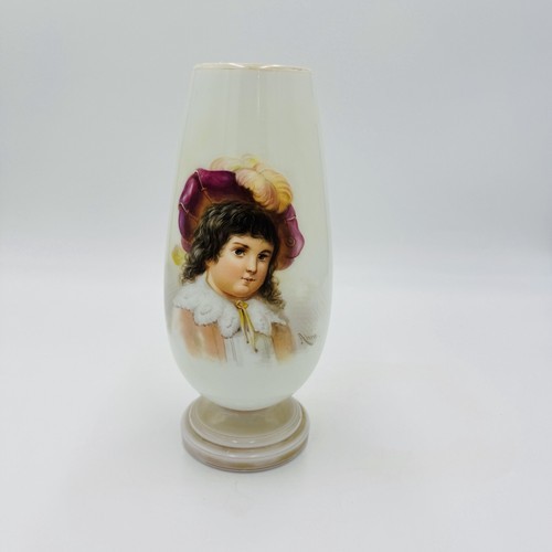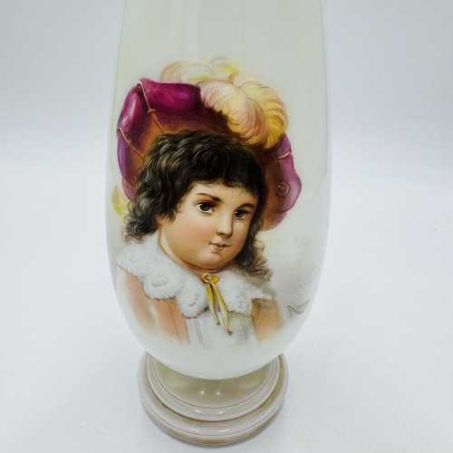 Bohemian Opaline Art Glass Vase Painted & Signed Portrait 9in Antique