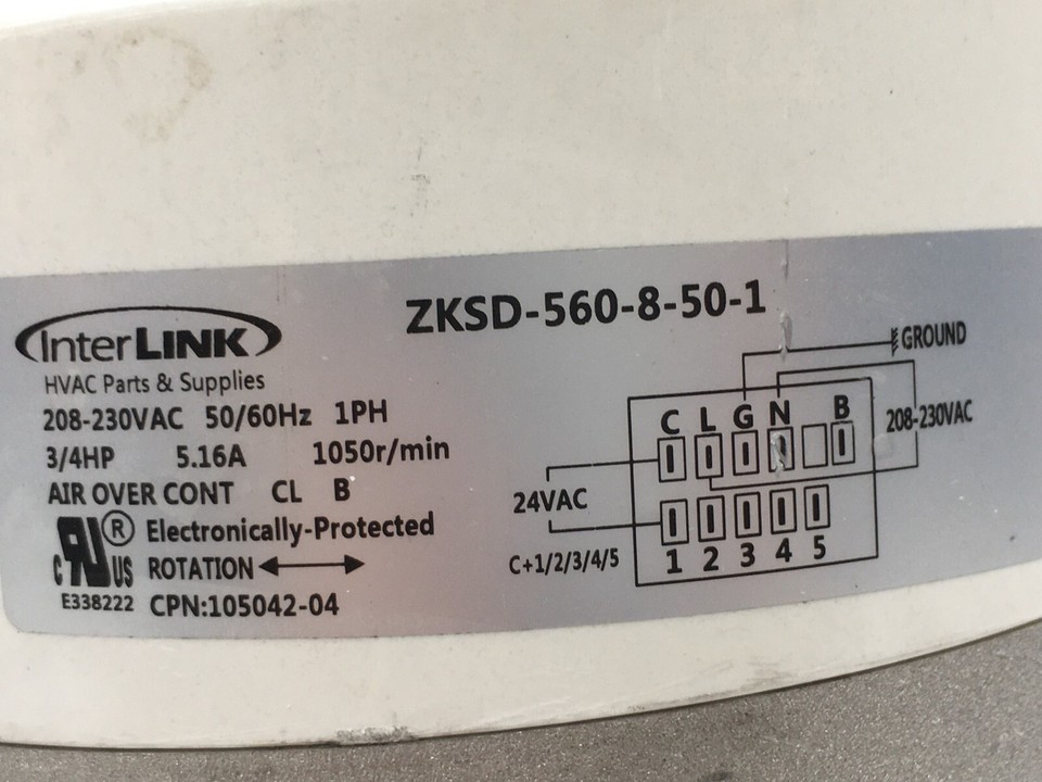 This is InterLink ZKSD-560-8-50-1 Programmable Blower Motor 208-230VAC 3/4 HP 1050 RPM 105042-04 619997-69 used part.