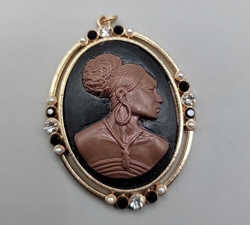 (Internal #CA30-147) Excellent side-view cameo of an African-American woman. New, molded from resin, this is a small cameo brass pendant in BLACK color with WHITE color background, mounted on - - brass with blue rhinestone accents, pendant.