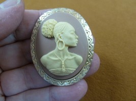 (Internal #CA20-91) Excellent side-view cameo of an African-American woman. New, molded from resin, this is a large cameo pin/pendant in OFF-WHITE color with MAUVE background color, mounted on ornate brass - - brass; pin/pendant is 2" tall x 1-1/2" wide. Cameo itself is 1-5/8" long x 1-1/4" wide or 40 x 30 mm. Clasp pin/pendant glued horizontally on the back (see last photo for an example).