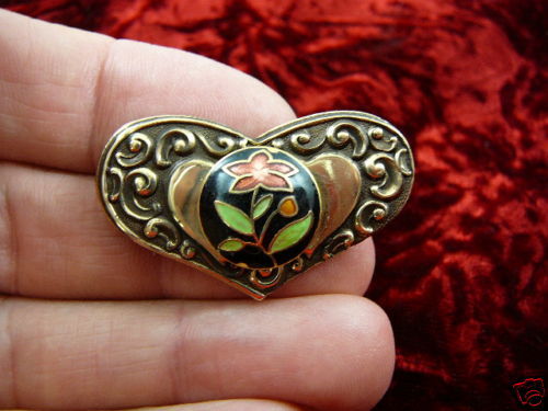 (Internal #BR-43) This is a beautiful pin (glued on the back) made of a black button with red flower on a piece of heart shaped brass, 1-3/8" wide x 7/8" long. This gorgeous - - stamped brass is antiqued, then buffed to create some shine. ?BRASS IS A GOLD COLOR?.