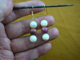 (Internal #EE-486-2) This is a beautiful pair of pink Rhodonite and White Mother of pearl, round shaped, three (10 mm) bead dangle earrings, on gold tone hypoallergenic french wires. This pair of earrings are nice, for a classic look.