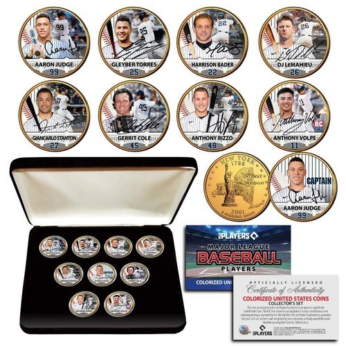 Introducing the NEW YORK YANKEES Officially Licensed 2023 JFK Half Dollar U.S 6-Coin Complete Set with Premium Deluxe Display Box! If you're a true fan of the New York Yankees, this is your chance to own a stunning collection of colorized coins featuring your favorite players: Judge, Volpe, Stanton, Cole, Torres, and Rizzo. These coins are not just ordinary half dollars ? they are genuine Legal Tender U.S. coins that have undergone a meticulous and unique colorization process. Using special inks and a multi-color authentic technique, these coins achieve an unparalleled level of detail, color saturation, and durability. We take pride in offering you the highest quality colorized coins in the industry. Each coin in this 6-coin set comes beautifully encapsulated in a premium coin capsule, ensuring its protection and preservation for years to come. And to showcase your collection in style, we have included a deluxe black felt coin display metal gift box. This elegant display box adds a touch of sophistication to your collection and serves as a conversation starter among fellow Yankees fans. Rest assured that your coins are not only authentic, but also officially recognized by every monetary authority worldwide. Each set comes with a Certificate of Authenticity, guaranteeing the legitimacy and collector edition status of your coins. Don't miss out on this opportunity to own a truly remarkable piece of Yankees memorabilia. Order your NEW YORK YANKEES Officially Licensed 2023 JFK Half Dollar U.S 6-Coin Complete Set today and show off your team pride in style!