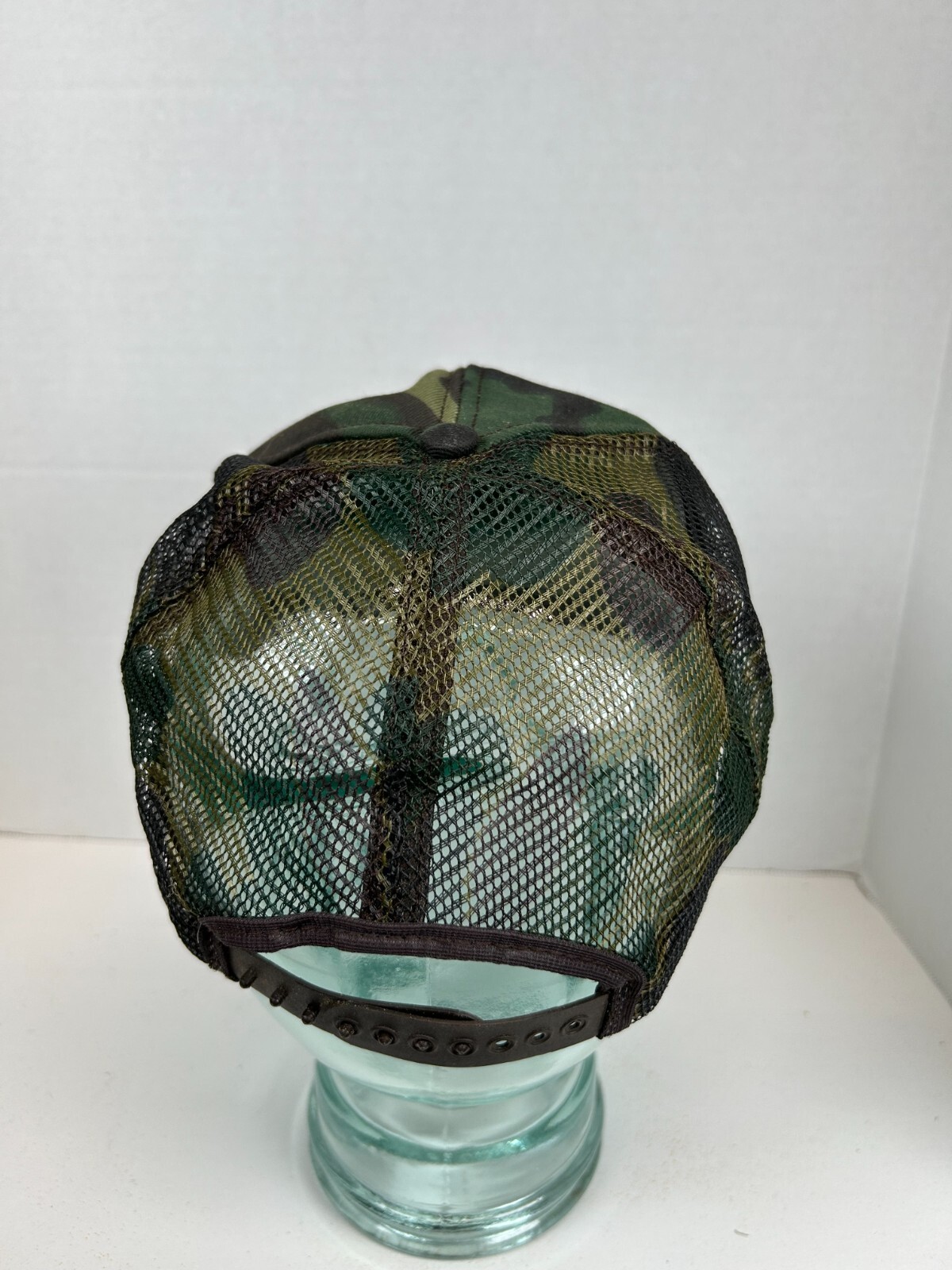 FIRST AMERICAN Large Gold Eagle Logo VTG 1980s USA Made Mesh Strap Back Hat CAMO