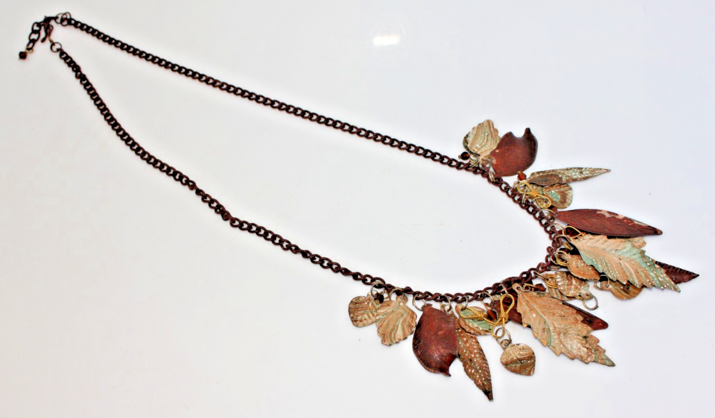 Vintage 24 in Brown Chain Necklace With Dangle Drop Painted Brass Leaf Charms