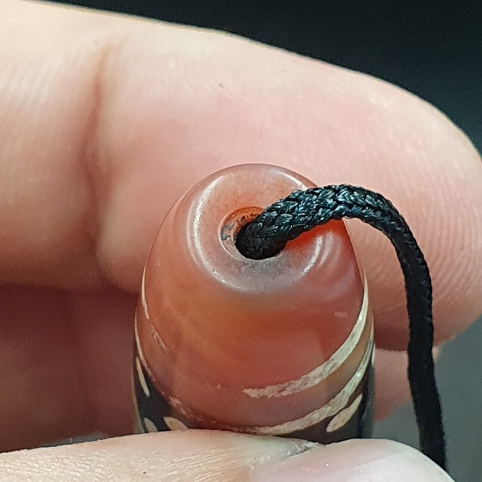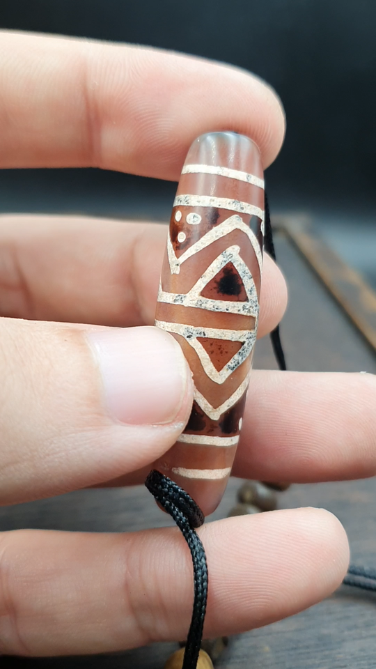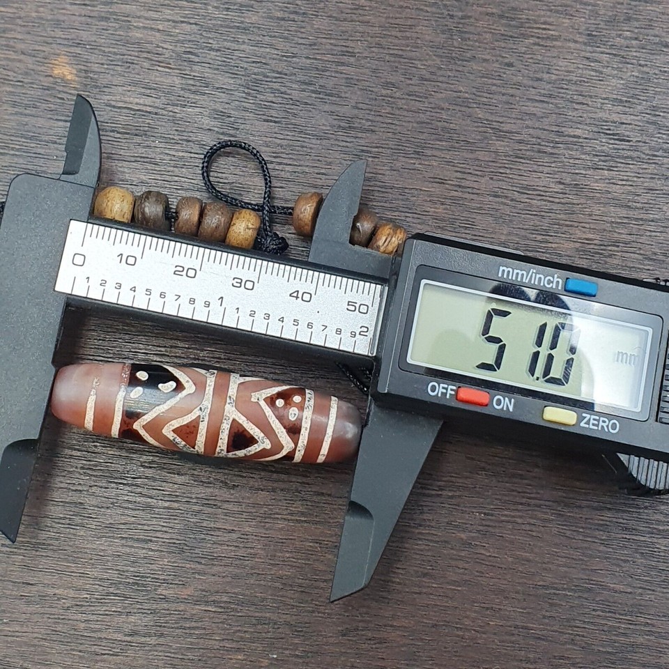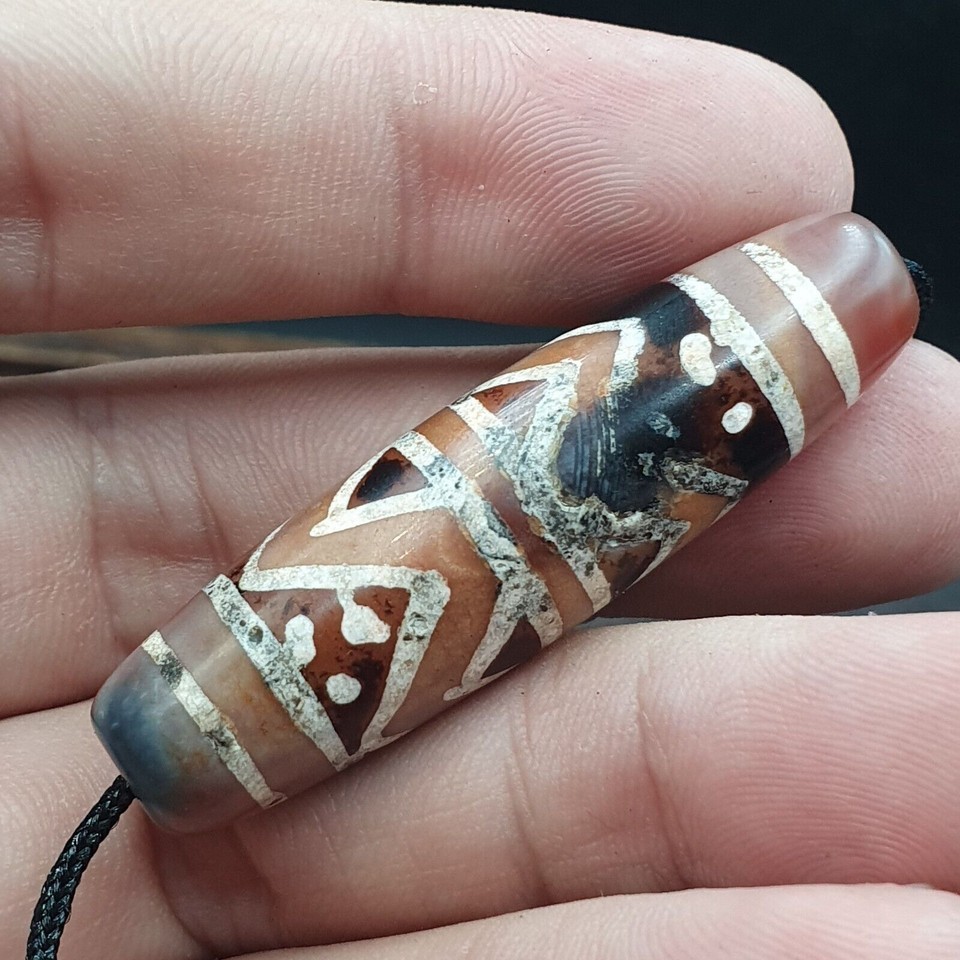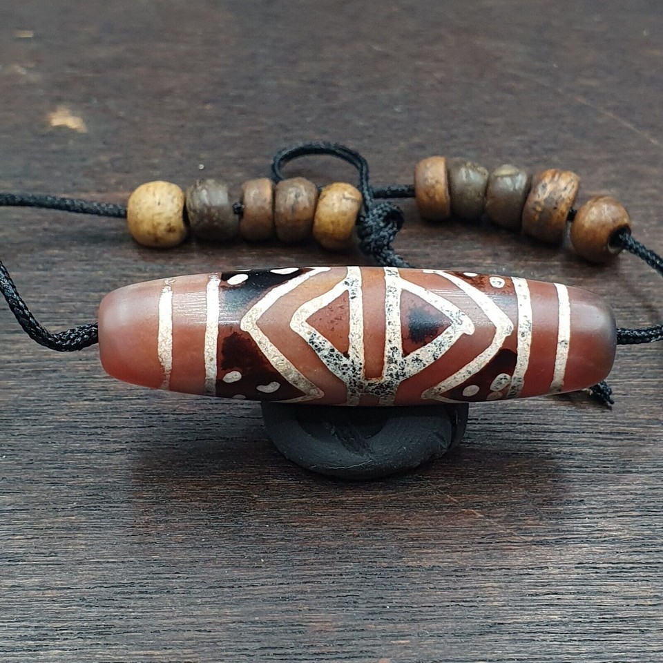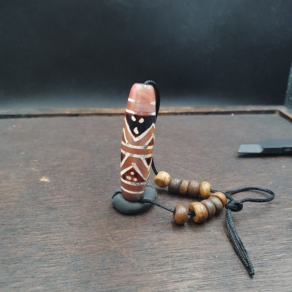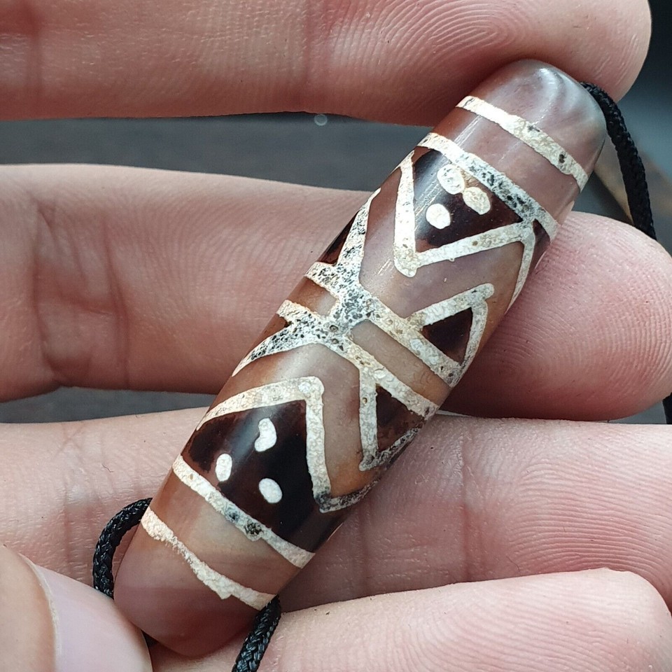 Cette amulette tibetaine ancienne presente une perle d'agate rose magnifiquement gravee avec un motif d'yeux en zigzag. La perle mesure 51 mm et serait originaire de la region PYU de Birmanie ou du Tibet. Son originalite vintage ajoute a son charme unique et en fait un excellent ajout a toute collection d'antiquites asiatiques.