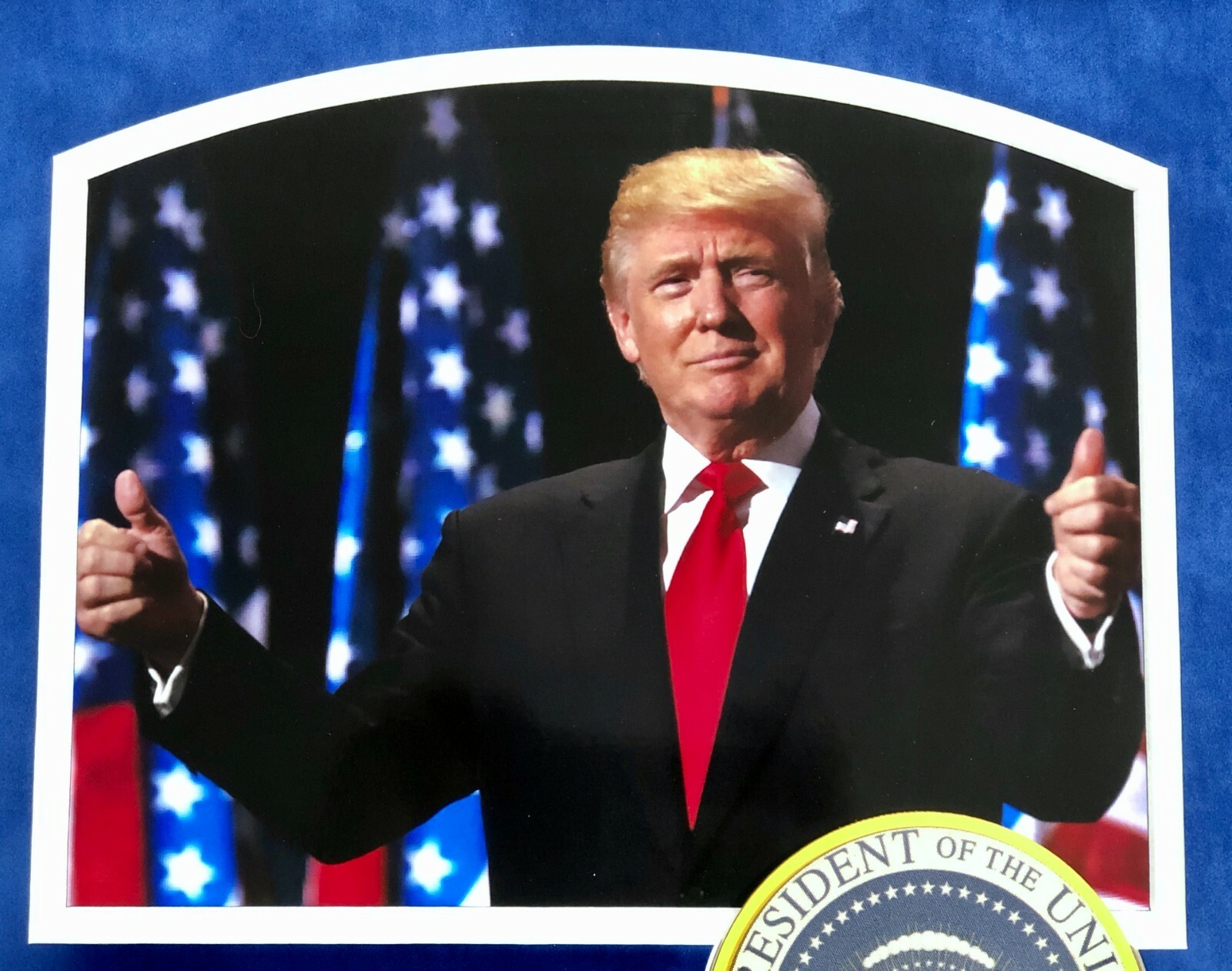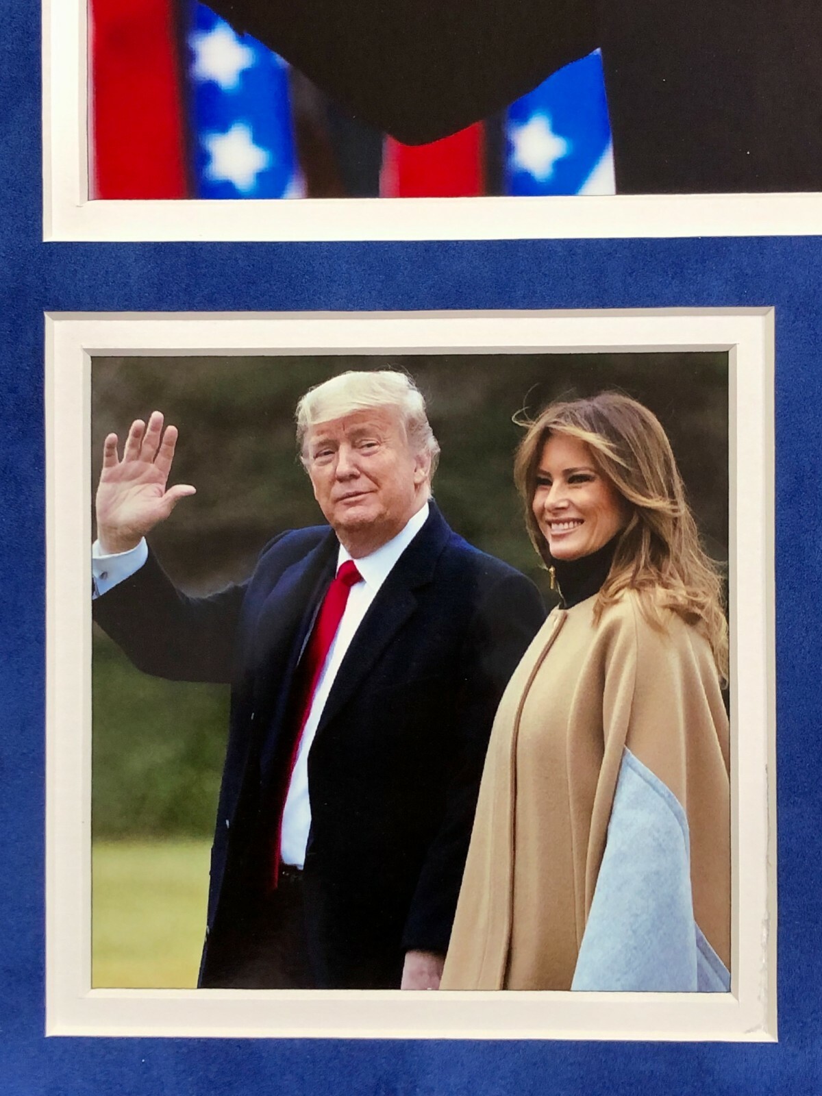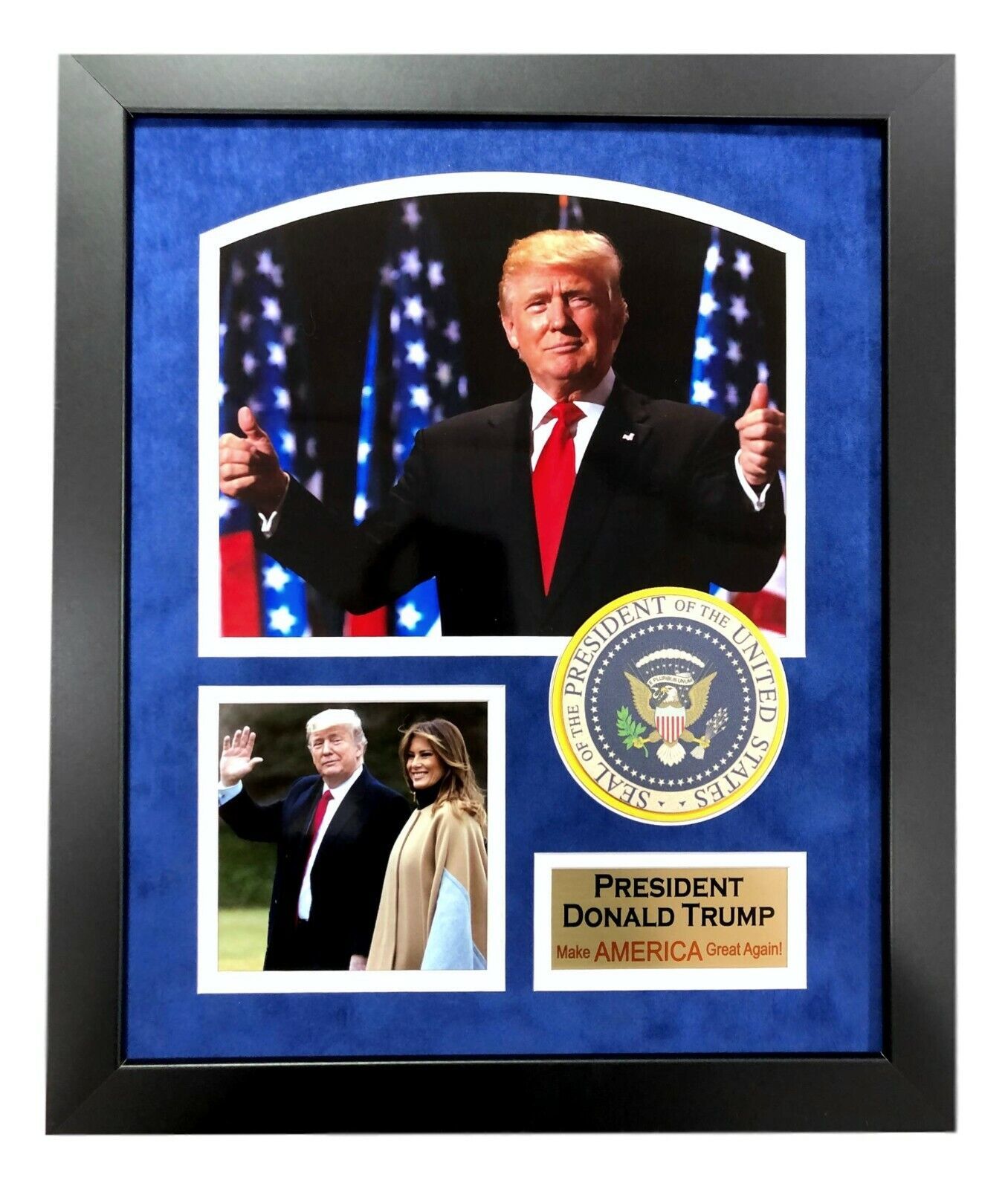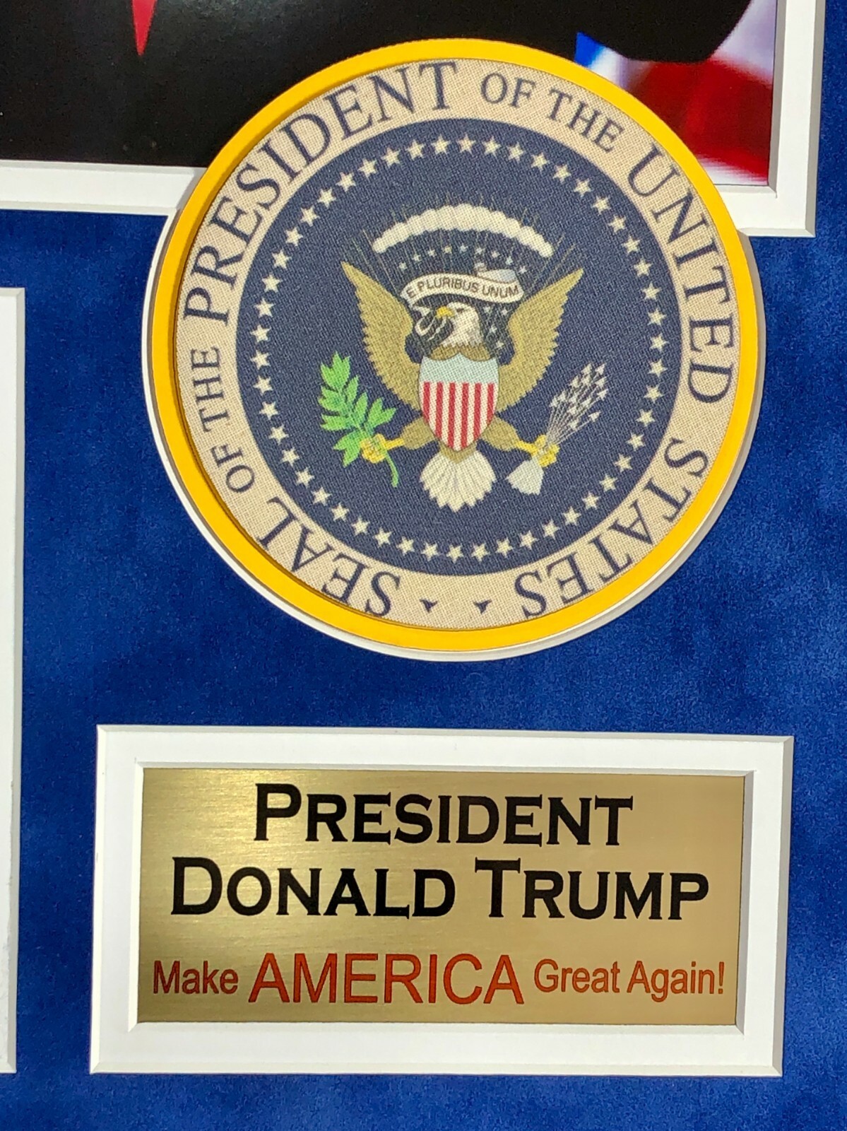 This item is professionally museum quality custom framed which includes double team matting which includes a suede top black mat as well as having its own custom gold MAGA nameplate that also reads his name, and 11"x14" and 5"x5" photos of the President and First Lady Melania. The piece features a custom laser cut Presidential seal made of silk that prominently displays midway in the frame! In addition, this collage measures approximately 18" x 15" in size in a black frame and a plexiglass display! There's an old expression, "you get what you pay for", if you are looking for a very high quality piece to hang on your wall instead of the common boring on the eye old framed item you see everywhere, then you have found THE piece for you!