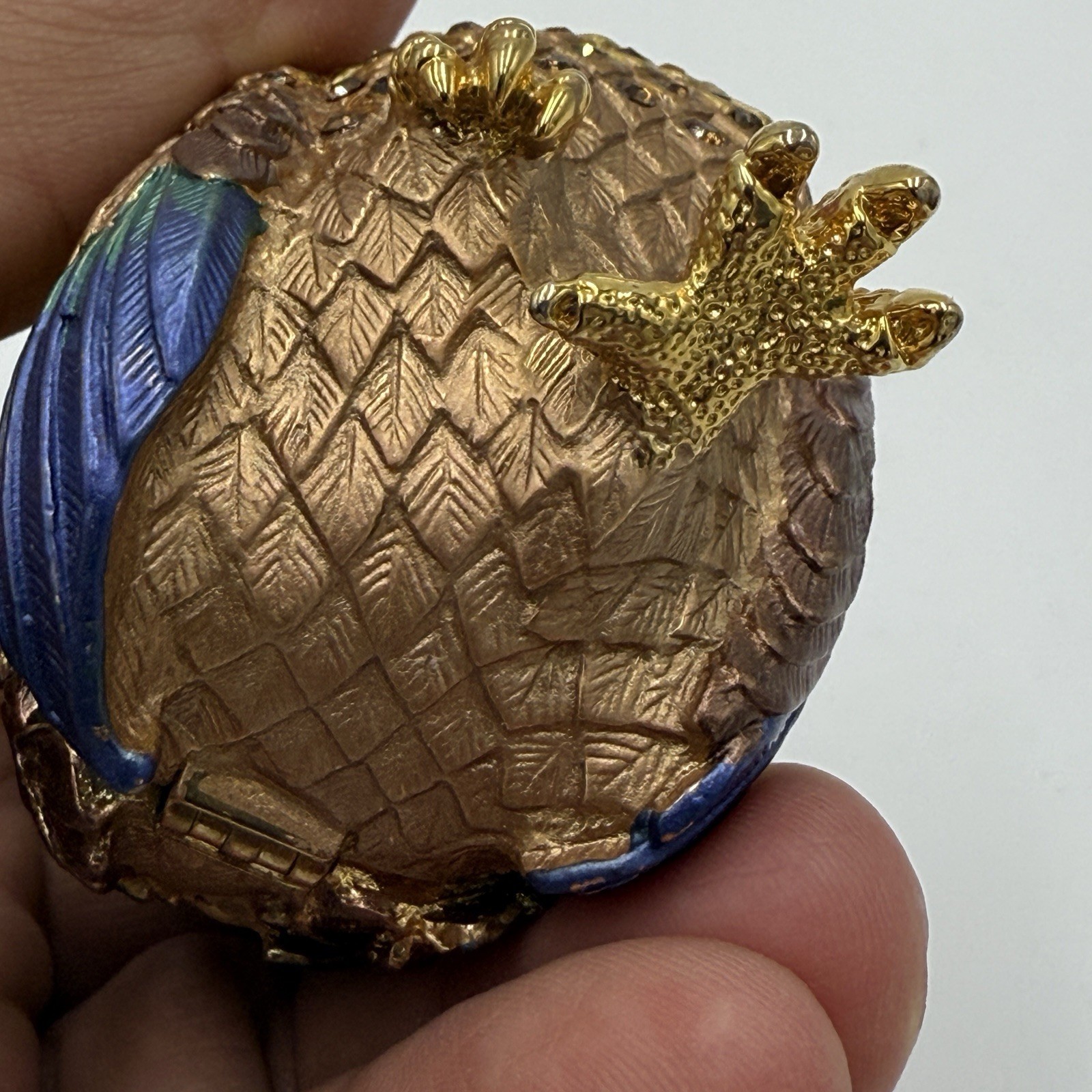 The Vintage Rucinni Rooster Trinket Box is a unique, handmade piece from the 1980s crafted with Swarovski crystals and metal enamel. This asymmetrical trinket box features an abstract rooster design in gold, making it suitable for all occasions and any room. The closure type is magnetic, and it comes in its original packaging, adding to its collectible value. Ideal for adults, this small-sized box is a stylish and eye-catching piece that adds a touch of vintage charm to any collection.